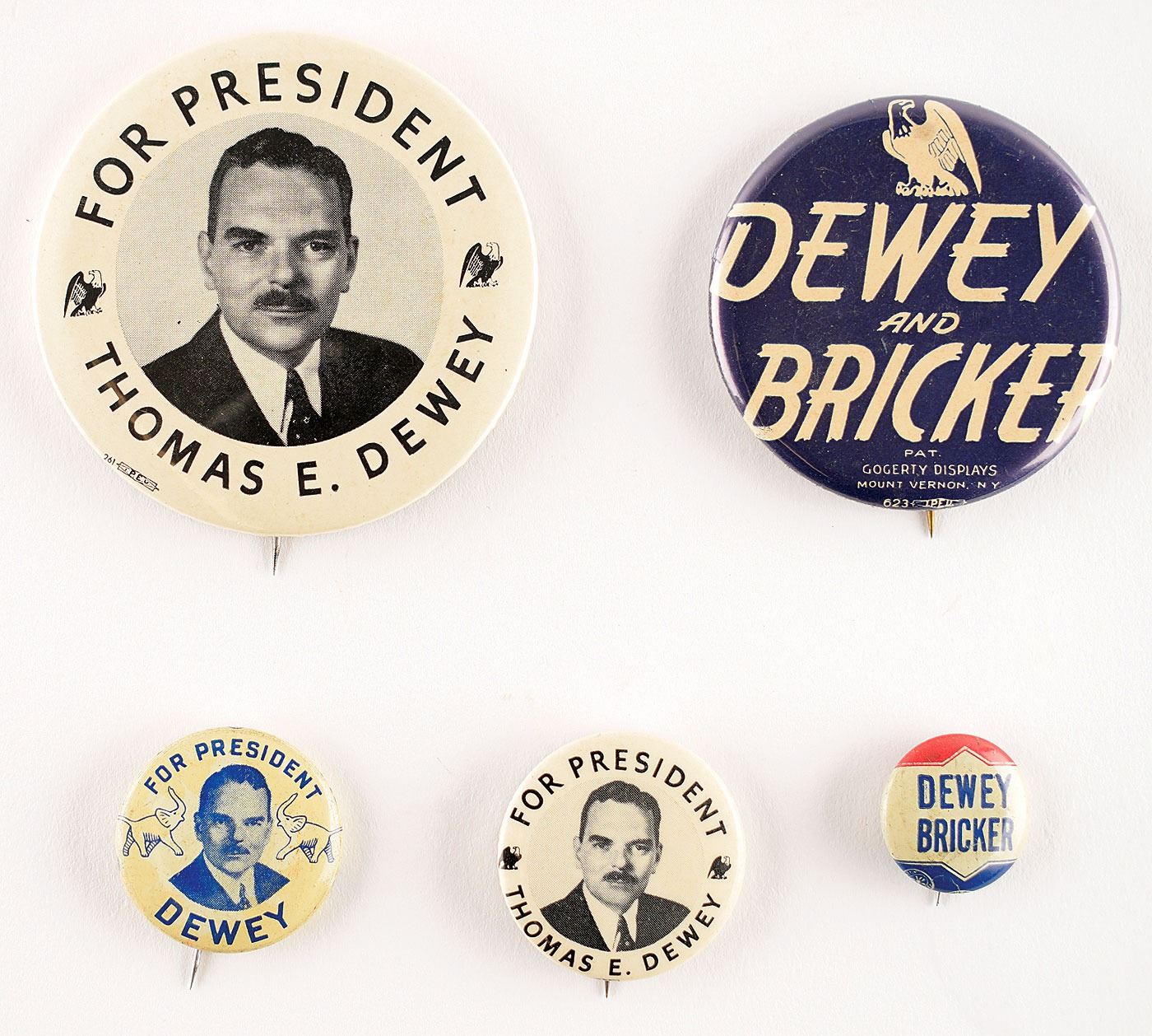 Five different pins from Thomas E. Dewey's Republican presidential campaigns in 1944 and 1948, measuring between 3/4? and 2 1/2?, featuring two "Dewey / Bricker" textual pins and three "For President" portrait pins. In overall fine condition.