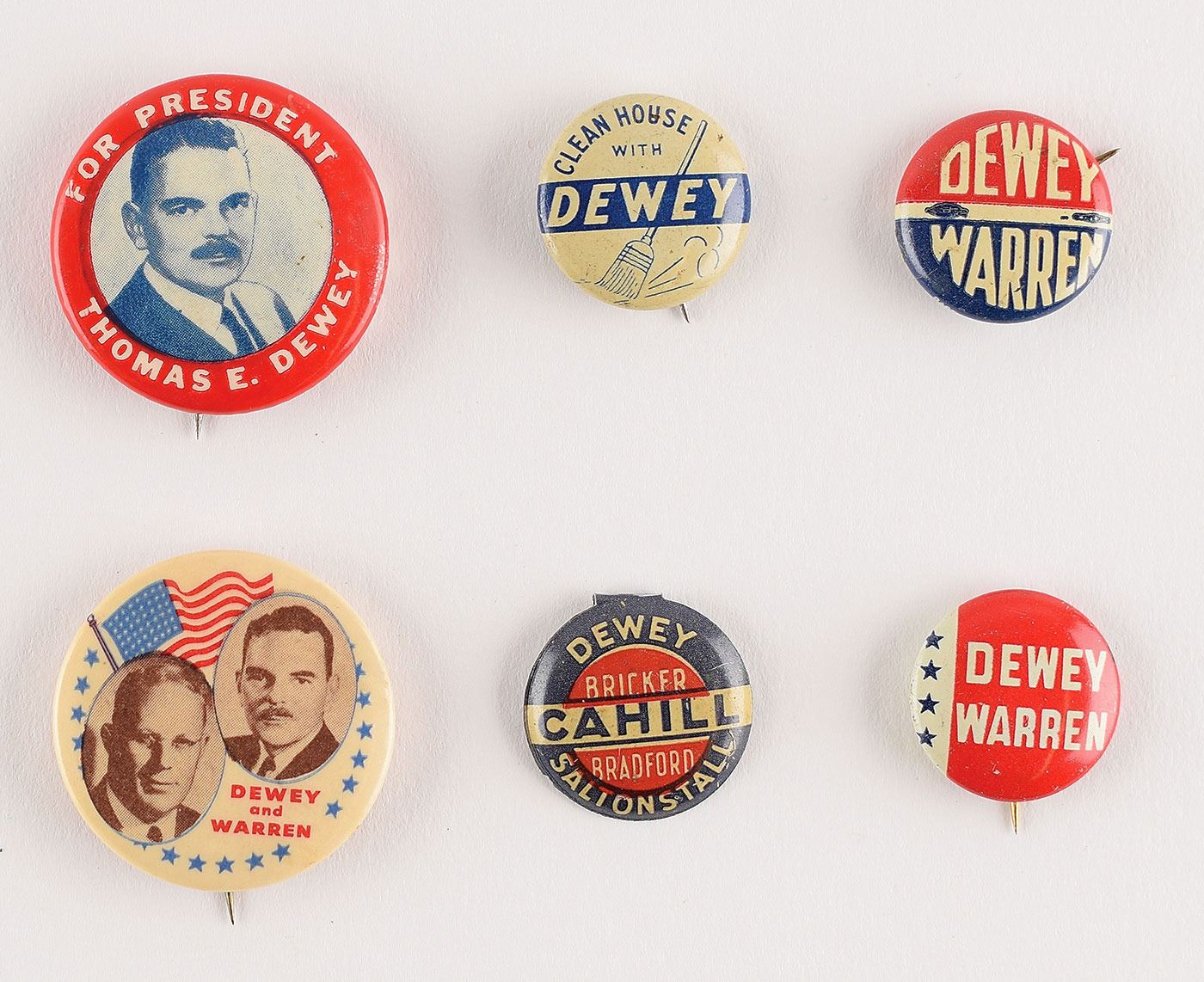 Five different pins from Thomas E. Dewey's Republican presidential campaigns in 1944 and 1948, measuring between 7/8? and 1 1/4?, featuring a "Dewey / Bricker" metal tab from the 1944 campaign, a jugate pin with Dewey and 1948 running mate Earl Warren, a "Dewey / Warren" textual pin, a broom with the slogan "Clean House with Dewey," and a "For President" portrait pin. In overall very good to fine condition.