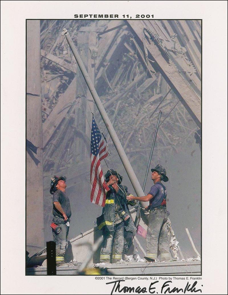 American photographer for The Bergen Record, best known for his photograph Raising the Flag at Ground Zero, which depicts firefighters raising the American flag at the World Trade Center after the September 11, 2001, attacks. Color 8.5 x 11 cardstock photo, ‘Raising the Flag at Ground Zero,’ signed in black felt tip “Thomas E. Franklin.” In fine condition, with lower left corner crease and a few bends.