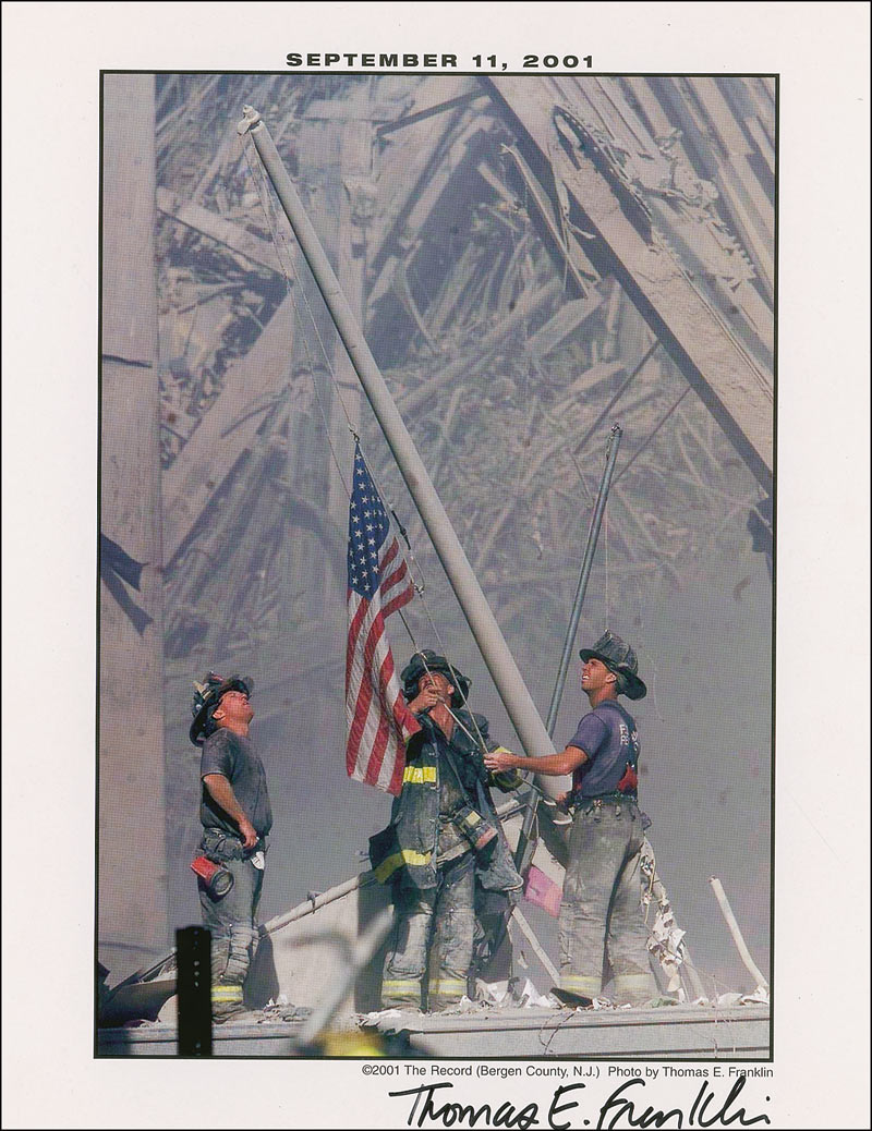 American photographer for The Bergen Record, best known for his photograph Raising the Flag at Ground Zero, which depicts firefighters raising the American flag at the World Trade Center after the September 11, 2001, attacks. Color 8.5 x 11 cardstock photo, ‘Raising the Flag at Ground Zero,’ signed in black felt tip, “Thomas E. Franklin.” In fine condition, with a few scattered surface creases and bends.