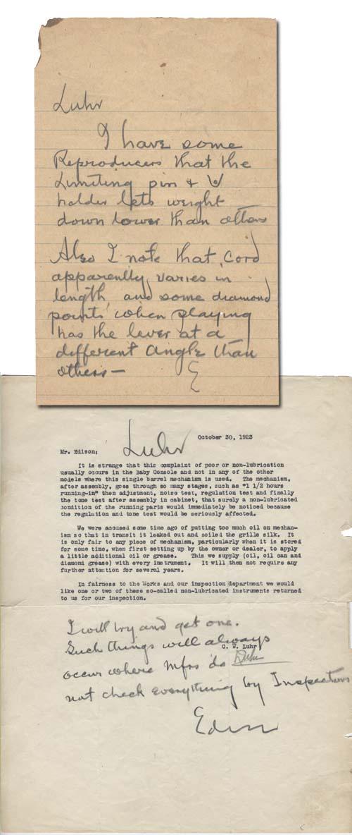 Two autograph letters signed by Thomas Edison, both to Charles W. Luhr, Vice President of Edison Phonograph Works. First octavo-sized letter written at bottom of a typed letter from Luhr dated 30 October 1923 in which Luhr requests a ''non-lubricated'' example of their Baby Console phonograph that was receiving consumer complaints. Edison writes, ''Luhr, I will try and get one. Such things will always occur where mfrs do not check everything by Inspectors. Edison''. Second quarto letter, with no place or date, on lined beige paper reads: ''Luhr / I have some Reproducers that the limiting pin & [drawing] holder lets weight down lower than others. Also I note that cord apparently varies in length and some diamond points when playing has the lever at a different angle than others - E''. Excellent pair of letters on Edison's famed phonograph invention.