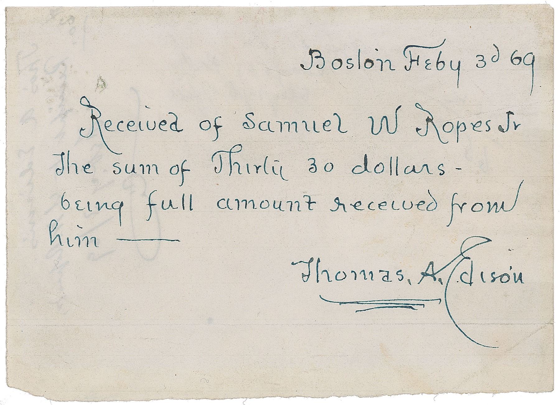 ADS, signed "Thomas A. Edison," one page, 5 x 3.5, Boston, February 3, 1869. Document related to his first successful invention, an improvement for telegraphs. In full: "Received of Samuel W. Ropes Jr the sum of Thirty 30 dollars-being full amount received from him." In fine condition, with mild soiling and expected document wear. Accompanied by copies of other documents associated with the transaction.