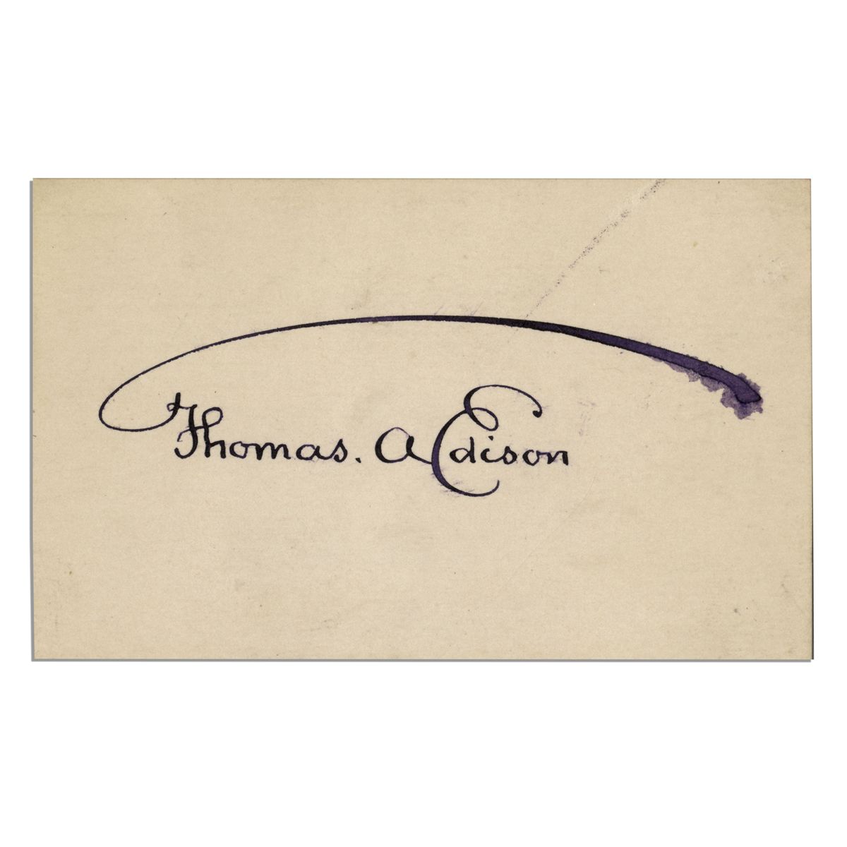 Thomas Edison signed card, showcasing his ''umbrella'' signature. Signed ''Thomas A Edison'' in purple ink upon a card measuring 3'' x 2''. Minor smudge to outer portion of umbrella and light scuffing, else near fine. Also includes a 4.5'' x 8'' photo of Edison bearing his printed signature.