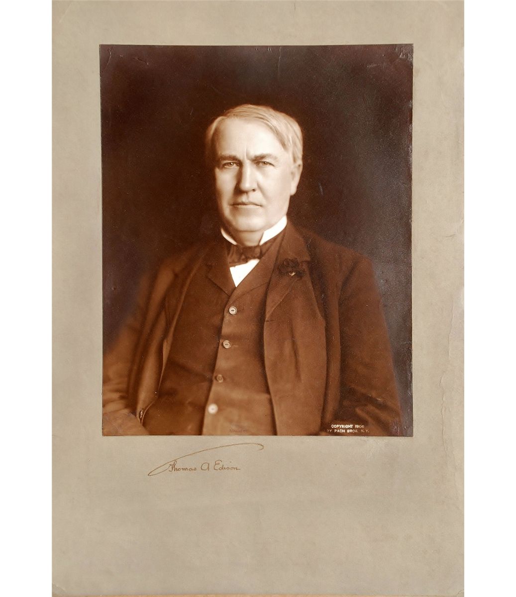 Distinguished vintage matte-finish 12"x16" signed photo,signed in the mat under his portrait with his umbrella signature in black ink “ Thos A. Edison.” In fine condition. Fine photo of this American inventor and businessman.