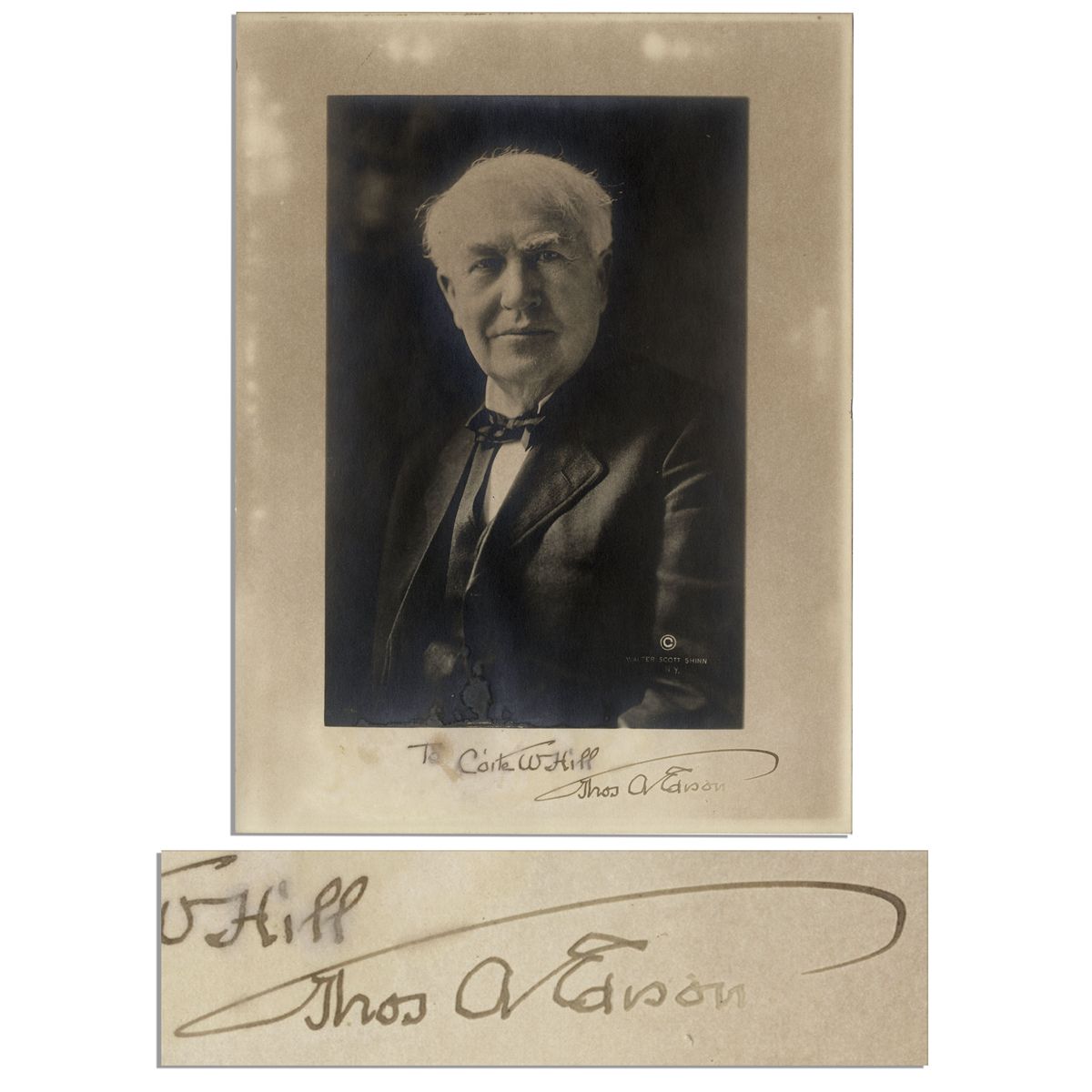 Thomas Edison photo signed. Portrait photo of the inventor bears his autograph inscription to the border along the bottom, ''To Coite W. Hill / Thos A Edison''. Image bears the copyright of Walter Scott Shinn, N.Y. Matte photo measures 7.75'' x 10''. Toning, fading to signature and dampstaining. In good condition.
