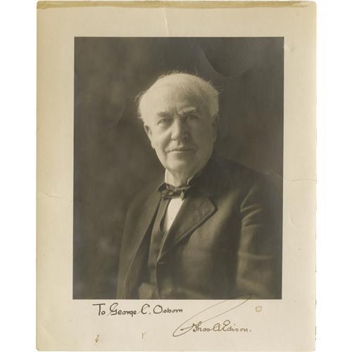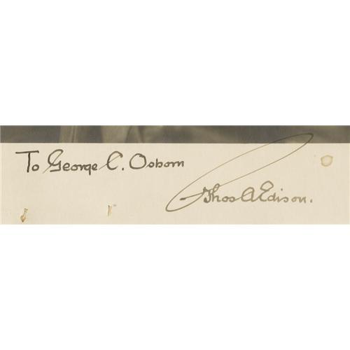 <B>Thomas Edison Photograph Inscribed and Signed</B></I> "<I>To George C. Osborn / Thos A Edison</B></I>". A handsome 8" x 10" sepia portrait with wide borders, signed below the image with his famous "umbrella" signature. The photo has 1.25" tears on either side that encroach into the image area slightly. There is also some light staining along the top edge, creasing, a tiny stain near the signature, and one pin-sized hole beneath the inscription. Still, a signed portrait of this legendary inventor well-suited for display. <BR><BR><b>Shipping:</b> Flat Material, Small (<a target="_blank" href="http://www.heritageauctions.com/common/shipping.php">view shipping information</a>)