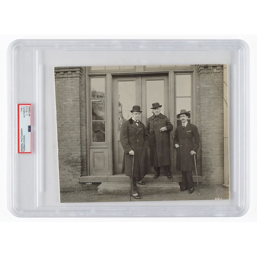 Sharp original vintage circa 1910s glossy 9.25 x 7.5 photograph of Thomas Edison with two dapper gentlemen outdoors, all wearing long overcoats. Inherent to the image is a small "TAE" copyright notation. The photograph has been professionally linen-backed. Encapsulated by PSA and certified as an authentic "Type I" photograph. In fine condition.