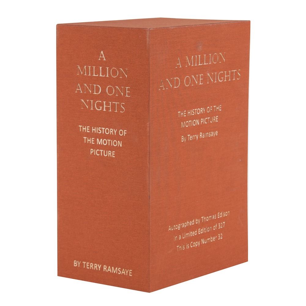 Signed book: A Million and One Nights: The History of the Motion Picture, Vol. I and II by Terry Ramsaye. First edition, limited issue, numbered 32/1926. NY: Simon & Schuster, 1926. Hardcovers, 7.75 x 10.75, totaling 868 pages. A prefatory blurb is signed in fountain pen by Edison, "Thos. A. Edison," in full: "This is, I believe, the first endeavor to set down the whole and true story of the motion picture. I have been in contact with the author's researches throughout his years of preparation and I am aware of an unrelenting effort at exact fact. A high degree of accuracy has been attained. Ramsaye's theories, opinions and deductions are his own." Also signed on the colophon by the author, "Terry Ramsaye." Autographic condition: fine. Book condition: professionally restored to VG/None, with scuffing to boards and spine leather, spines hand-lettered, and restorations to spine leather and corners of cover paper. Housed in a handsome custom-made slipcase. A highly desirable example of this important early history of moving pictures, beginning prior to Edison's Kinetoscope and concluding with the silent film era.