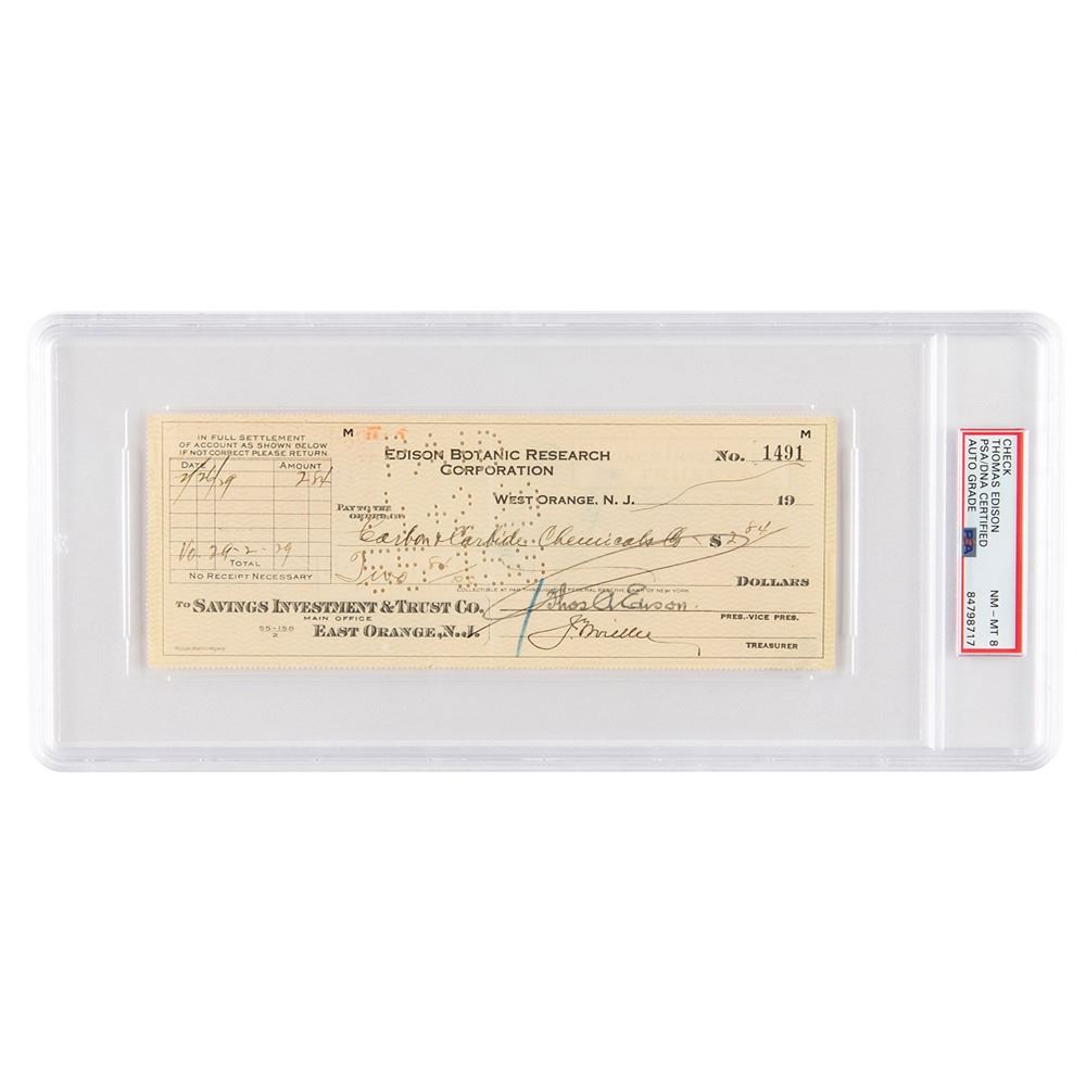 Edison Botonic Research Corporation business check, 8.25 x 3, filled out in another hand and signed by Thomas Edison, "Thos. A. Edison," payable to Carbon & amp; Carbide Chemicals Corporation for $2.84, [February 26, 1929]. In fine condition. Encapsulated and graded by PSA/DNA as "NM-MT 8."