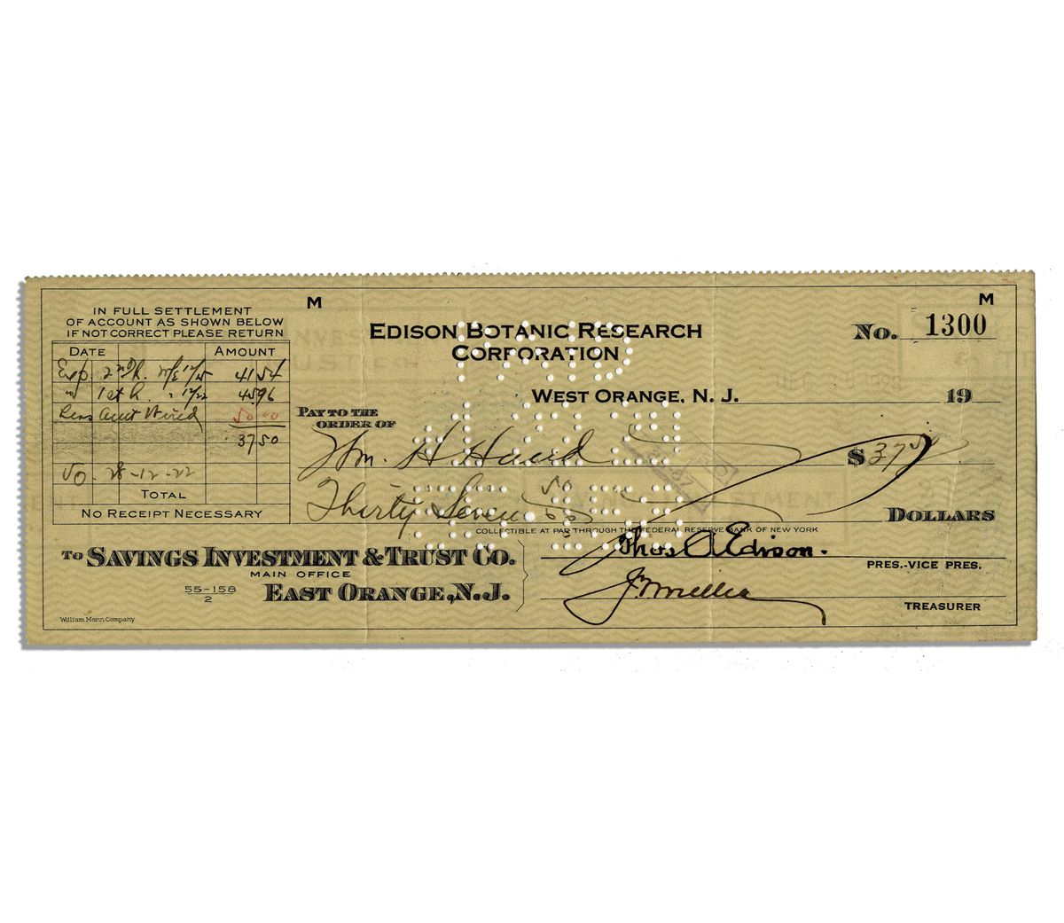 Thomas Edison check signed ''Thos A Edison'' as president of the Edison Botanic Research Corporation. Check from the EBRC is dated 26 December 1928 and made out to William H. Hacid in the amount of $37.00. Measures 8.25'' x 3''. Standard cancellations, else near fine.