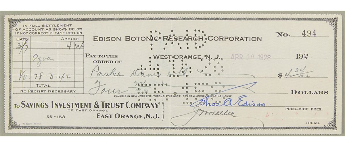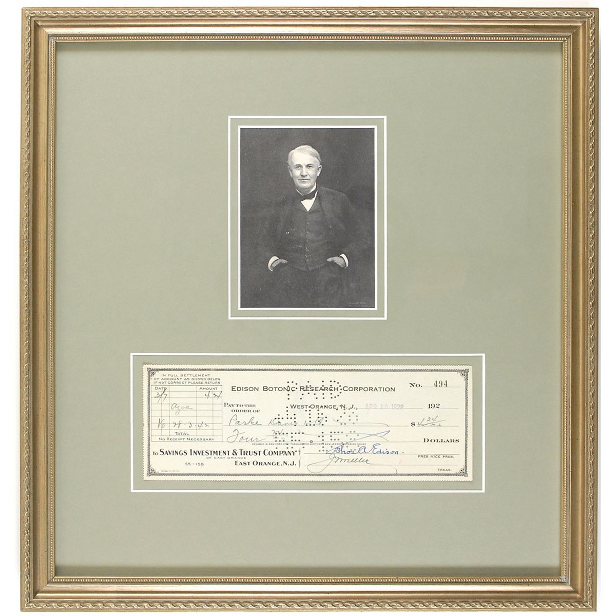 Edison Botanic Research Corporation business check, 8.5 x 3, filled out in another hand and signed by Edison, payable to Parke Davis & Co. for $4.24, stamp-dated April 10, 1928. Handsomely double-matted and framed with an image of the inventor to an overall size of 15 x 15.75. In fine condition, with a pair of diagonal folds (passing through two letters of the signature), and expected cancellation holes (affecting the first name).