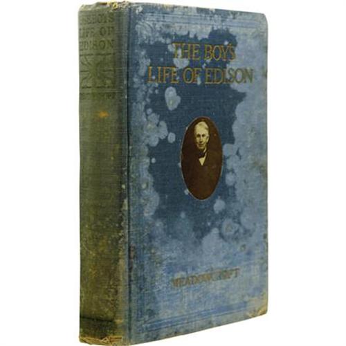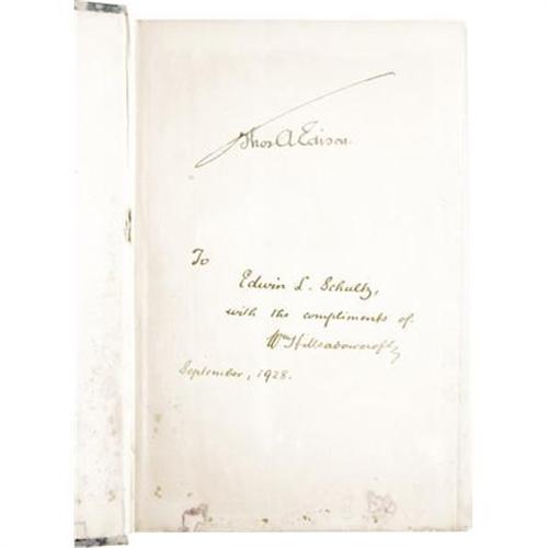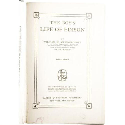 <B>Thomas Edison: Signed Edition of William H. Meadowcroft's <I>The Boy's Life of Edison</B></I></B></I> <I>with Autobiographical Notes by Mr. Edison.</B></I> (New York & London: Harper & Brothers Publishers, 1921), 367 pages, blue cloth with gilt lettering on the spine and front board and a oval sepia photograph of Edison pasted on the front cover, 12mo (5.25" x 7.5"), no dust jacket (as issued). Boldly signed "<I>Thos A Edison</B></I>" on the front free endpaper. Also inscribed and signed by the author just under Edison's signature "<I>To Edwin L. Schultz, with the compliments of Wm H Meadowcroft September, 1928</B></I>". According to the title page of this book, <I>The Boy's Life of Edison</B></I> is one of only two authorized biographies of Thomas Edison, and was personally approved by him. The book is in about good condition, with noticeable soiling of the boards, bumped corners, and moderate edge and spine wear. The spine shows some sunning, which has slightly faded the spine titles. Light foxing and staining to the endpapers, but the internal text is largely free of flaws. Small purple ink stains present to bottom of first 15 pages. A scarce Edison signed biography.<BR><BR><b>Shipping:</b> Books & Catalogs (<a target="_blank" href="http://www.heritageauctions.com/common/shipping.php">view shipping information</a>)