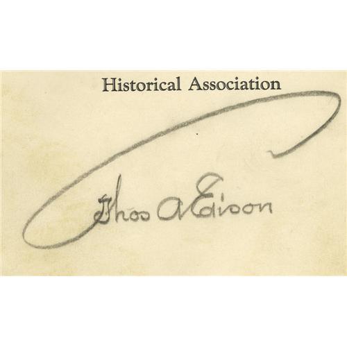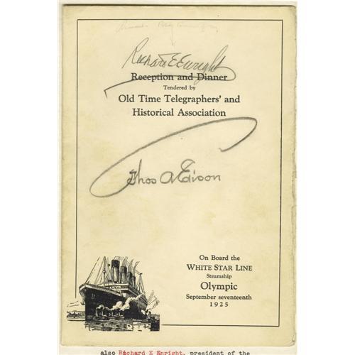 <B>Thomas Edison Signed Menu,</B></I> "Reception and Dinner Tendered by Old Time Telegraphers' and Historical Association", four pages, 6" x 9", New York City, September 17, 1925. The large blank center of the menu's cover carries in pencil the classic "<I>Thos A Edison</B></I>" autograph that was used for the Edison logo. The top of the menu cover carries an additional signature being that of Richard E. Enright, president of the association holding the dinner and NYC Police Commissioner. Lightly soiled, else very fine condition. Being published during the height of Prohibition, this menu boasts after-dinner cigars and...ginger ale.<BR><BR><b>Shipping:</b> Flat Material, Small (<a target="_blank" href="http://www.heritageauctions.com/common/shipping.php">view shipping information</a>) <BR><BR><B>Important noti