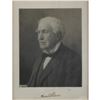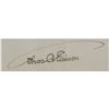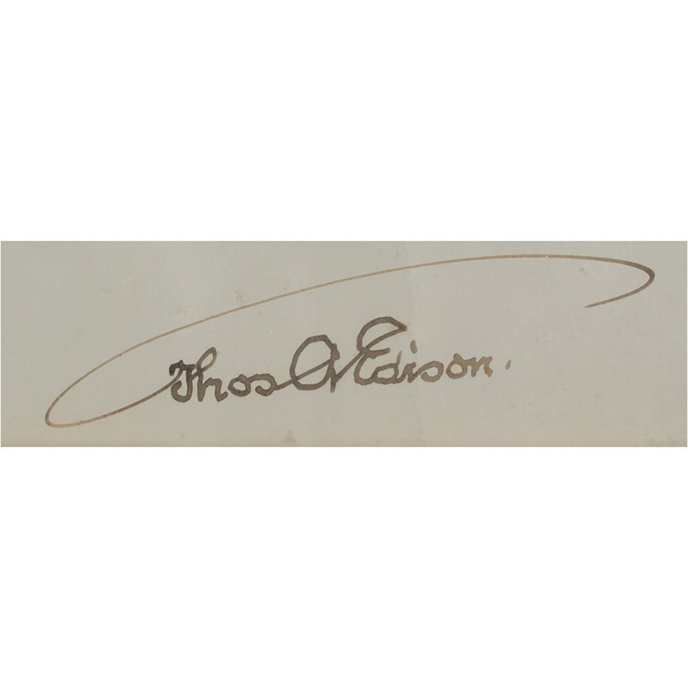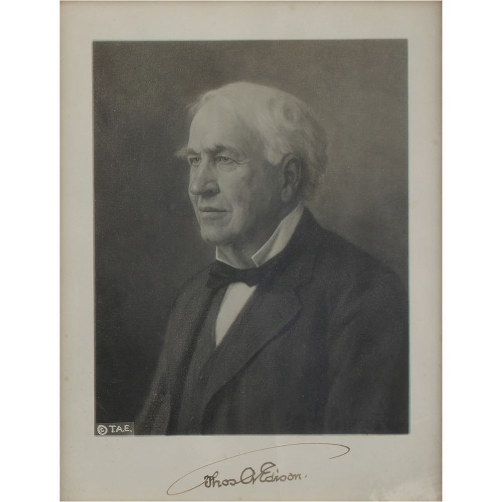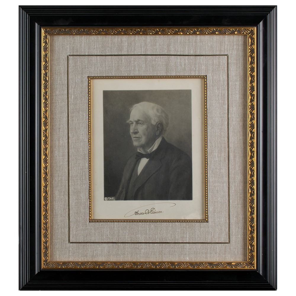 Superb vintage matte-finish 7.25 x 9 photo of an artist's portrait of Edison, signed in the lower border in fountain pen with his iconic 'umbrella' signature, "Thos. A. Edison." Cloth-matted and framed to an overall size of 16.75 x 18.5. In very good to fine condition, with a light crease to the left of Edison's head, and an area of abrasion to the lower right corner.
