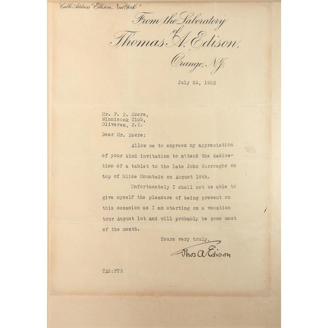 Thomas Edison typed letter signed upon his Orange, New Jersey Laboratory stationery, dated 25 July 1923. Addressed to F.P. Moore at the Winnisook Club in Oliverea, New York, Edison regrets that he will not be able to attend the dedication of a tablet to the late nature essayist John Burroughs in the Catskills (the plaque is still present today). Letter measures 8.5'' x 11''. Toning from previous framing and small waterstains along top margin, else very good. Strong Edison ''umbrella'' signature.