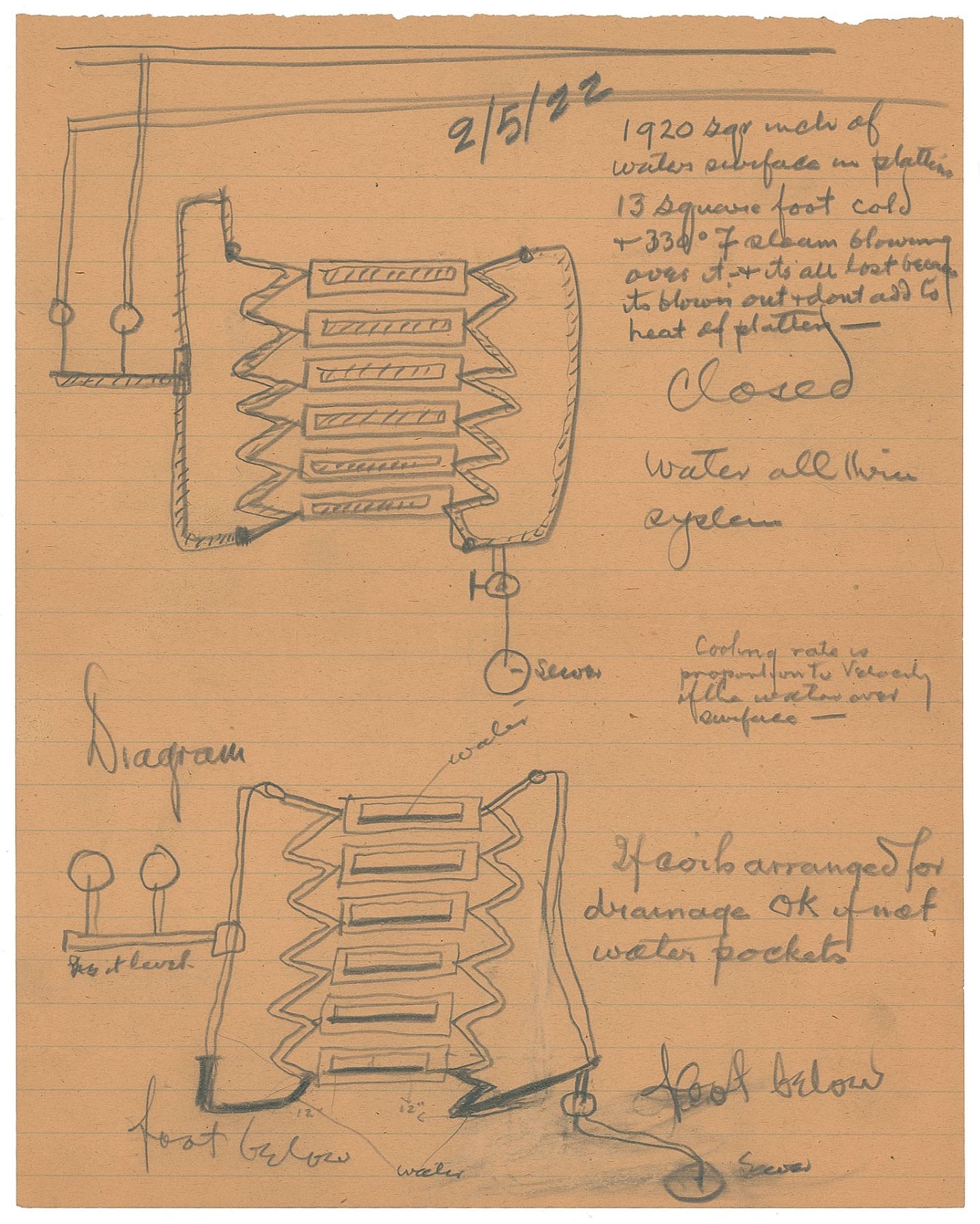 Remarkable technical notes and diagrams by Thomas Edison, accomplished in pencil on an off-white 8.5 x 10.5 lightly lined sheet, unsigned, dated to February 5, 1922. The sheet features what appears to be a pair of steam-powered devices with layered coils and a drainage system that feeds to the sewer. Edison’s notes, in part: “1920 sqr inch of water surface in platters, 13 square foot cold + 330° F steam blowing over it—+it’s all lost because to[o] blown out & don’t add to heat of platter—,” “Closed, water all thru system,” “Cooling rate is proportion to velocity of the water over surface—,” and “If coils arranged for drainage OK if not water pockets.” Edison writes “Diagram” to left side and adds notations to various parts. In fine condition, with three small tears to right edge, the largest roughly 1.25˝ in length, not affecting handwriting. Not long after the date of this diagram, a film crew traveled to West Orange, New Jersey to document the 75-year-old Edison going about a typical day. In this silent film, a six-part documentary entitled A Day with Thomas A. Edison, the camera captures the prolific inventor discussing new ideas with employees, conferring with his secretary, and checking in on the newest production techniques for producing one of his most famous inventions: the incandescent light bulb. Technical notes and designs in the hand of Edison are exceedingly rare, with this example particularly attractive given its bold realization and wealth of handwriting.