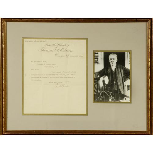 <B>Thomas Edison Typed Letter Signed</B></I> "<I>Thos A Edison</B></I>", a fine example of his famous "umbrella" style signature. One page, 8" x 9.5", Laboratory of Thomas A. Edison letterhead, Orange, New Jersey, February 12, 1915, to Mr. Orlando W. Hart. Edison sends thanks for Mr. Hart's "...message of congratulations and good wishes on my birthday..." This letter was written the day after Edison's 68th birthday and during a very busy and productive period in his professional life. He had achieved major steps forward in the designs of his phonograph and dictating machine and had recently introduced the Kinetophone (talking motion picture). The War in Europe was forcing him to find, invent, or manufacture himself various substances needed for both industry and the war effort. This letter is in fine condition and is attractively double matted with a B&W photo of Edison standing in his lab to an overall size of 19.5" x 15.5".