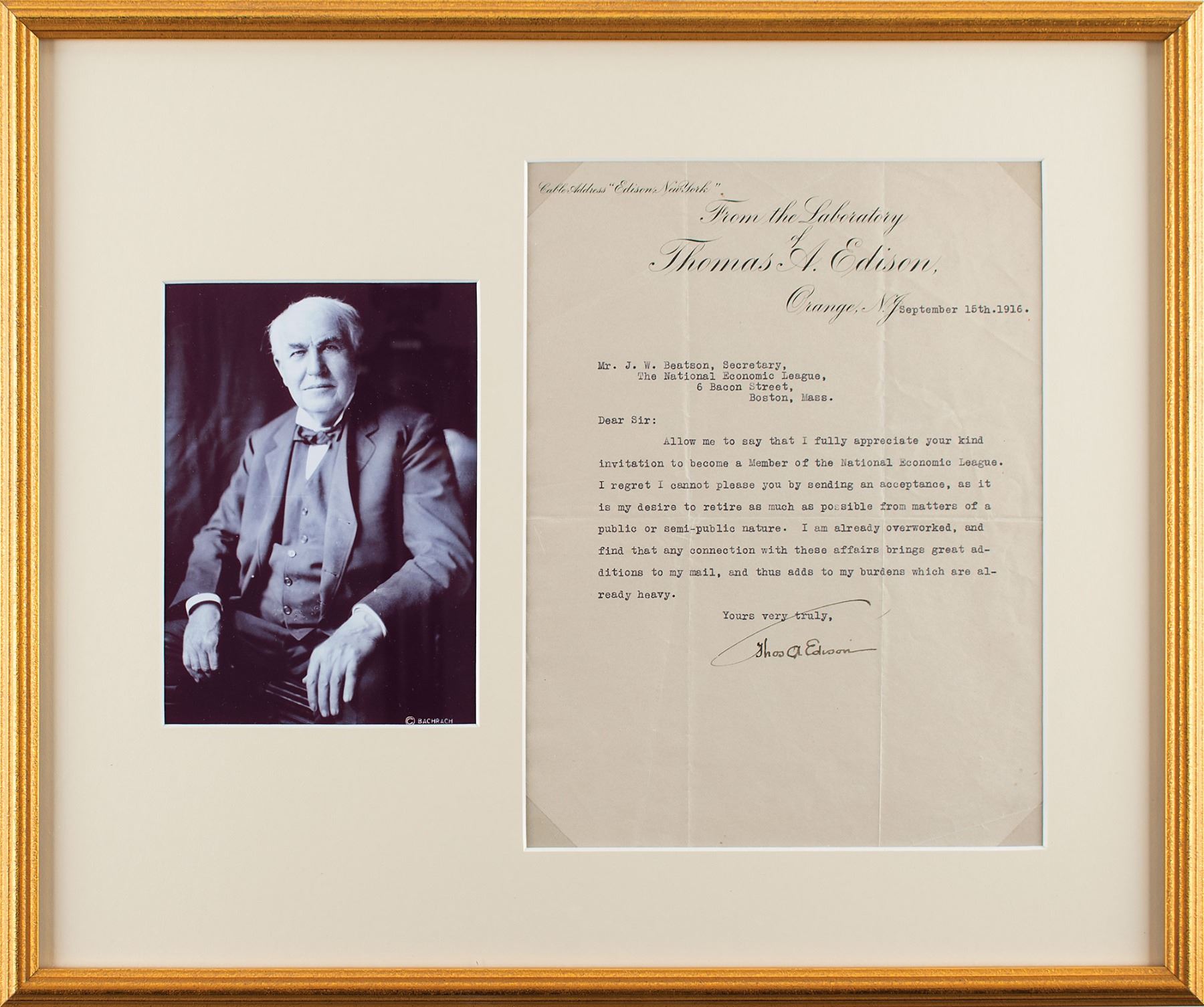 TLS signed “Thos. A. Edison,” one page, 8 x 10.5, From the Laboratory of Thomas A. Edison letterhead, September 15, 1916. Letter to J. W. Beatson, secretary of the National Economic League. In full: "Allow me to say that I fully appreciate your kind invitation to become a Member of the National Economic League. I regret I cannot please you by sending an acceptance, as it is my desire to retire as much as possible from matters of a public or semi-public nature. I am already overworked, and find that any connection with these affairs brings great additions to my mail, and thus adds to my burdens which are already heavy." Handsomely matted and framed under UV-resistant acrylic alongside a portrait to an overall size of 18.25 x 15.5. In very good to fine condition, with intersecting folds and some light creasing.