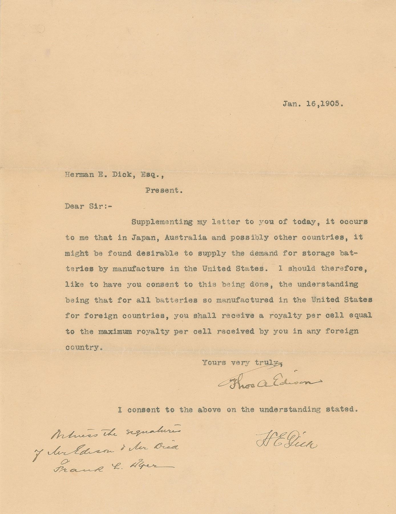 TLS signed “Thos. A. Edison,” one page, 8.5 x 11, January 16, 1905. Letter to Herman E. Dick, regarding the international disbursement of batteries, in full: "Supplementing my letter to you of today, it occurs to me that in Japan, Australia and possibly other countries, it might be found desirable to supply the demand for storage batteries by manufacture in the United States. I should therefore, like to have you consent to this being done, the understanding being that for all batteries so manufactured in the United States for foreign countries, you shall receive a royalty per cell equal to the maximum royalty per cell received by you in any foreign country." Dick agrees to the proposition and has countersigned below. In fine condition. Herman Dick was a founding director of the Edison Ore Milling Syndicate and, by 1905, served as a foreign agent promoting Edison's battery in Europe and beyond.