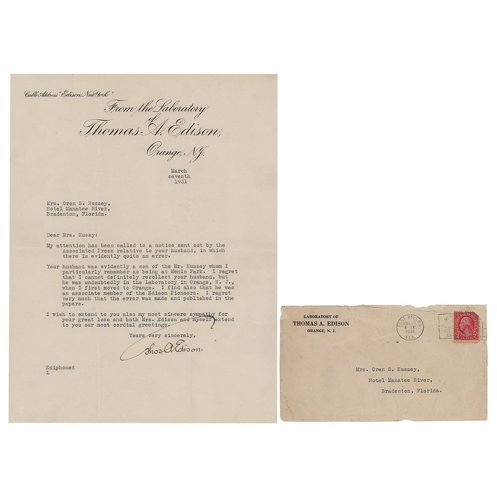 TLS signed “Thos. A. Edison,†one page, 8.5 x 11, From the Laboratory of Thomas A. Edison letterhead, March 7, 1931. Letter to Mrs. Oren S. Hussey, in part: "Your husband was evidently a son of the Mr. Hussey whom I particularly remember as being at Menlo Park. I regret that I cannot definitely recollect your husband, but he was undoubtedly in the Laboratory in Orange, N.J., when I first moved to Orange. I find also that he was an associate member of the Edison Pioneers. I regret very much that the error was made and published in the papers." Marked "Ediphoned" in the lower left, indicating that the text was dictated by Edison prior to its being typed. In fine condition, with a light paperclip impression to the top edge. Accompanied by the original mailing envelope.