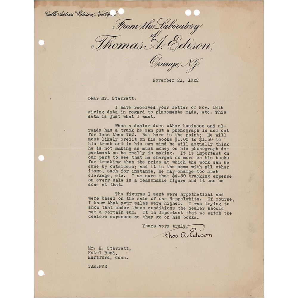 TLS signed “Thos. A. Edison,” one page, 8.5 x 11, From the Laboratory of Thomas A. Edison letterhead, November 21, 1922. Letter to one of his salesmen, Hal Starrett, in part: "When a dealer does other business and already has a truck he can put a phonograph in and out for less than 75¢. But here is the point: He will most likely credit on his books $1.00 to $1.50 to his truck and in his own mind he will actually think he is not making as much money on his phonograph department as he really is making. It is important on our part to see that he charges no more on his books for trucking than the price at which the work can be done by outsiders; and it is the same with all other items, such for instance, he may charge too much clerkage, etc. I am sure that $4.50 trucking expense on every sale is a reasonable figure and it can be done at that. The figures I sent were hypothetical and were based on the sale of one Heppelwhite. Of course, I know that your sales were higher. I was trying to show that under these conditions the dealer should net a certain sum. It is important that we watch the dealers expenses as they go on his books." In fine condition, with staining along the top edge, and multiple punch holes along the edges.