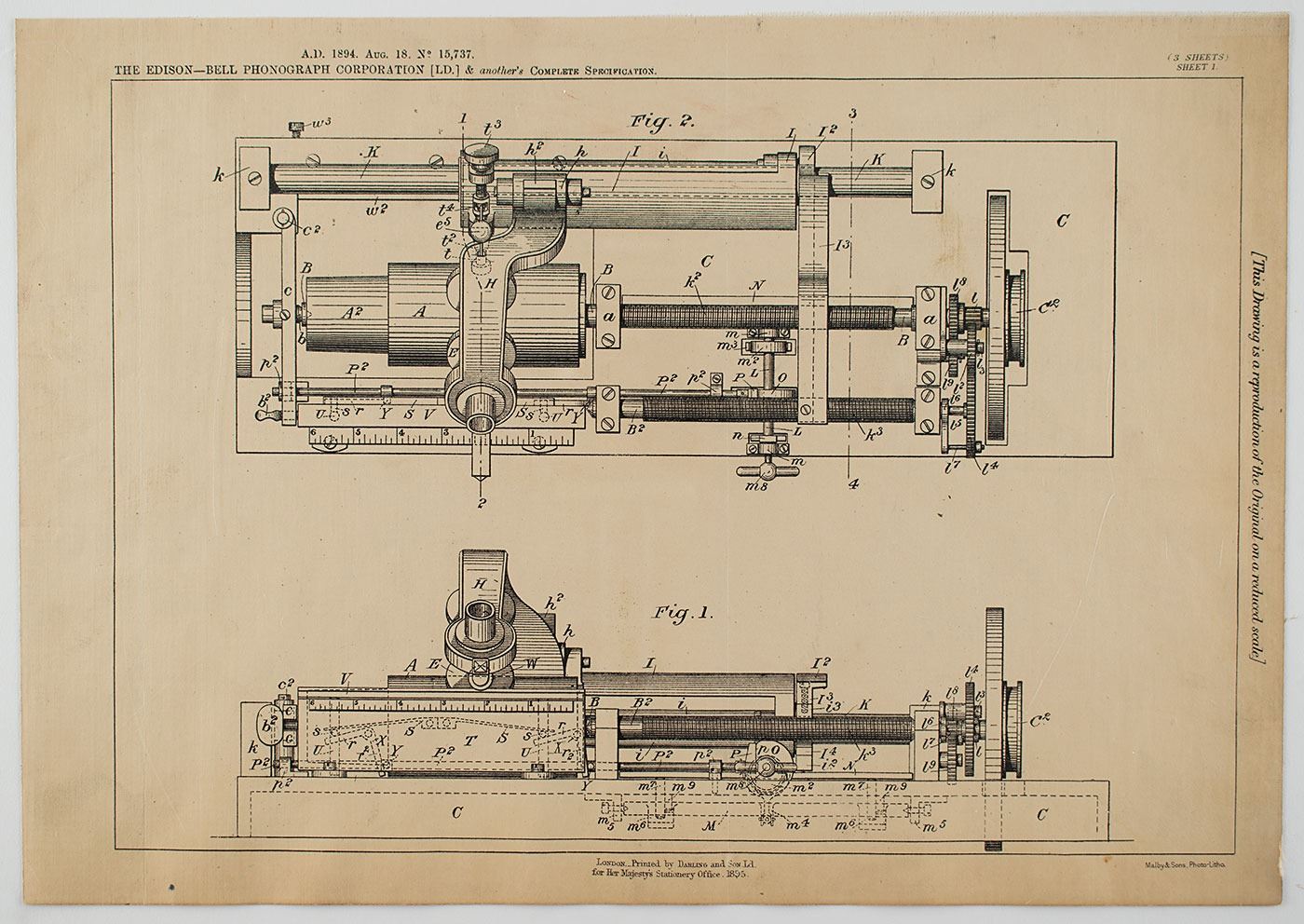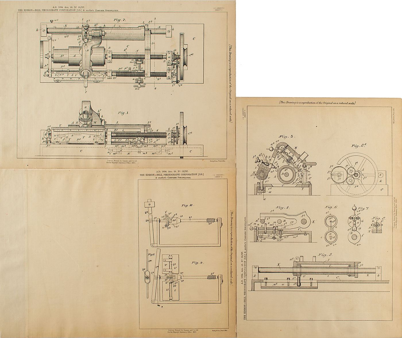 Original linen-backed patent lithographs for an improvement to the worm shaft of a phonograph by the Edison Bell Phonograph Corporation, three pages, 14.25 x 10, August 18, 1894. The improvement relates to vane governors for phonographs in which the vanes on the worm shaft are connected by cranks with a sliding pin passing down an axial hole in the shaft, and connected to a lever so that shifting the lever changes the position of the vanes. In ten figures, these diagrams depict the system in detail. The top borders read: "A.D. 1894. Aug. 18. No. 15,737. The Edison–Bell Phonograph Corporation [Ld.] & another's Complete Specification." The lower borders feature the printed text: "London. Printed by Darling and Son Ld. for Her Majesty's Stationery Office. 1895" and "Malby & Sons, Photo-Litho." The right borders read: "This Drawing is a reproduction of the Original on a reduced scale." In fine condition. The Edison–Bell Phonograph Corporation was founded in 1892 to handle Thomas Edison's phonograph manufacturing rights in Great Britain; Edison Bell was given the exclusive right to manufacture phonographs in Britain, including the right to any improvements made by Thomas Edison, Alexander Graham Bell, Chichester Bell, or Charles Sumner Tainter, all of whom had made significant advancements in phonograph technology.