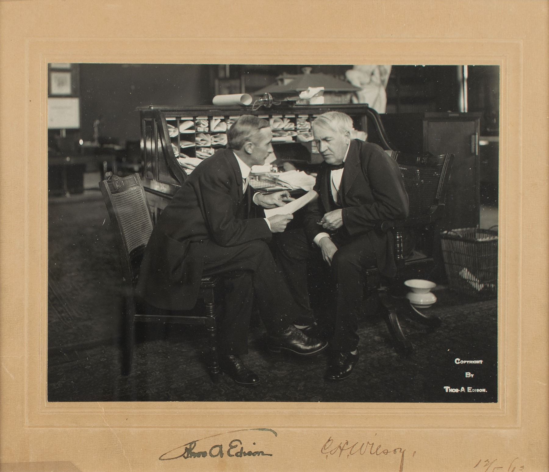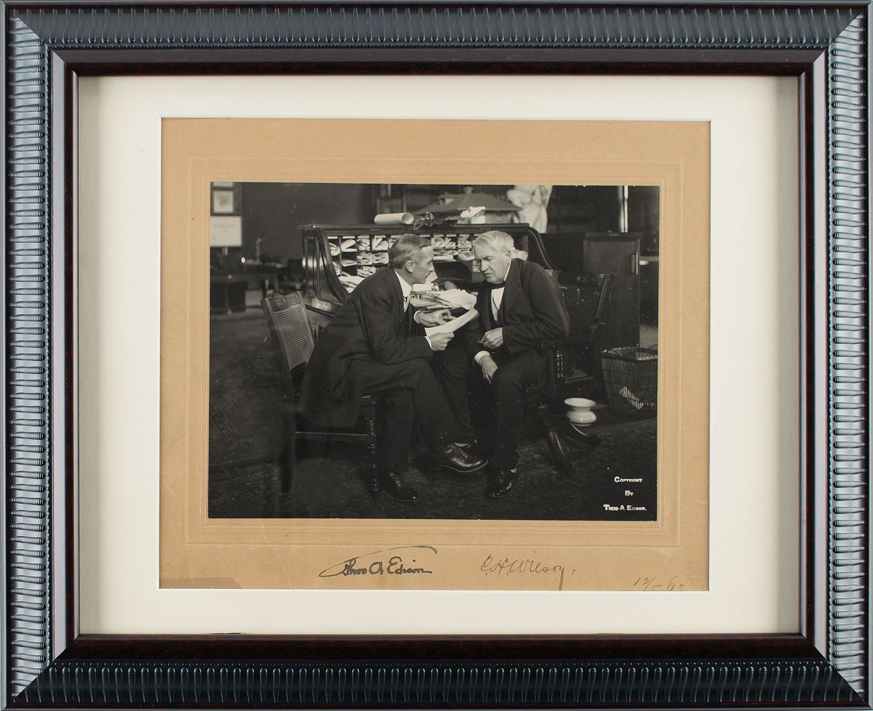 Fantastic vintage matte-finish 8.5 x 6.5 photo of Thomas Edison seated with his employee Carl H. Wilson (vice president and general manager of Thomas A. Edison, Inc.), affixed to its original 10.5 x 9 mount, signed on the mount in ink, "Thos. A. Edison" and "C. H. Wilson, 12/5/13." Inherent to the lower right corner of the image in white text is "Copyright by Thos. A. Edison." Matted and framed to an overall size of 17 x 14. In fine condition, with a couple of light creases to the lower left corner of the mount. Thomas A. Edison, Inc. was the primary holding company for Edison's varied manufacturing concerns, which ranged from phonographs to storage batteries. A desirable image boasting a bold Edison 'umbrella' autograph.