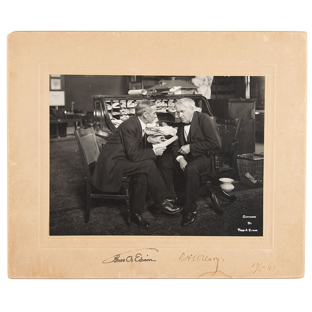 Fantastic vintage matte-finish 8.5 x 6.5 photo of Thomas Edison seated with his employee Carl H. Wilson (vice president and general manager of Thomas A. Edison, Inc.), affixed to its original 12 x 10 mount, signed on the mount in ink, "Thos. A. Edison" and "C. H. Wilson, 12/5/13." Inherent to the lower right corner of the image in white text is "Copyright by Thos. A. Edison." In very good to fine condition, with light soiling, scuffing, and staining to the mount. Thomas A. Edison, Inc. was the primary holding company for Edison's varied manufacturing concerns, which ranged from phonographs to storage batteries. A desirable image boasting a bold Edison 'umbrella' autograph.
