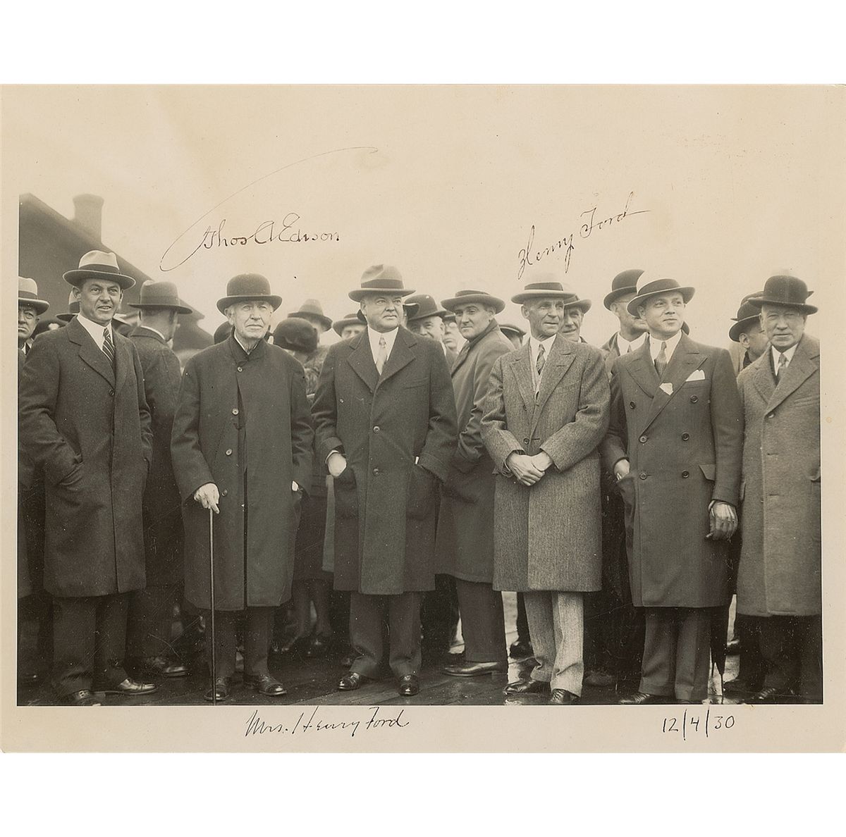 Superb vintage pearl-finish 10 x 8 photograph of Edison, Ford, Herbert Hoover, and other dignitaries at the 1929 dedication of Ford’s Greenfield Village complex, signed in fountain pen, “Thos. A. Edison,” “Henry Ford,” and “Mrs. Henry Ford,” and dated December 4, 1930, in the lower border. Mild toning and soiling, a few trivial dings, and slightly irregular ink adhesion to signatures, which nonetheless remain clear and distinct. Ford founded the Edison Institute (also known as Greenfield Village) in Detroit in 1929, with the aim of collecting American history ‘as written into things their hands made and used.’ The centerpiece was the Menlo Park laboratory of Thomas Edison. The entire complex—including the laboratory proper, all of the outbuildings, and dirt that it stood on—was transported and rebuilt. This singular tribute to Edison’s genius was dedicated on October 21, 1929, in a ceremony broadcast over nationwide radio. Edison, in the presence of such dignitaries as President Herbert Hoover, ‘recreated’ the original light bulb in his newly relocated laboratory.