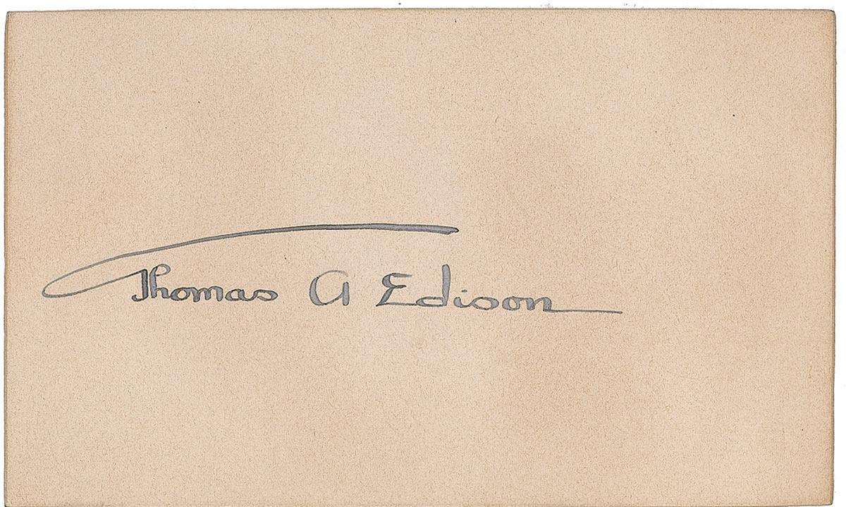 Ink ‘umbrella’ signature, “Thomas A. Edison,” on an off-white 4 x 2.5 card. In fine condition, with scattered mild toning, not detracting from Edison’s bold signature.