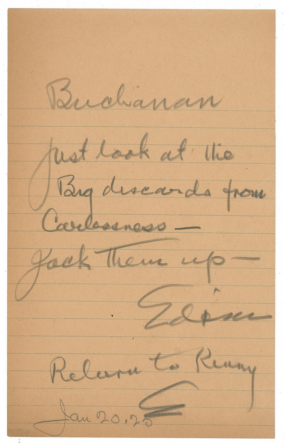 ANS, in pencil, signed “Edison,” one page, lightly-lined, 5 x 8, January 20, 1925. Edison writes to [Jaffrey P.] Buchanan, manager of Edison’s Record Disc Division. In full: “Just look at the Big discards from Carelessness—Jack them up—Edison.” Adding “Return to Renny, E.” Uniform toning, a bit heavier to top edge, otherwise fine condition.
