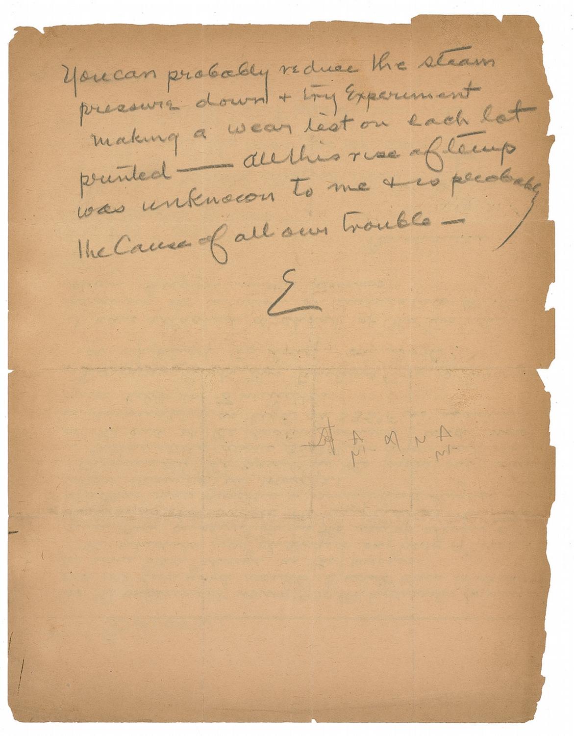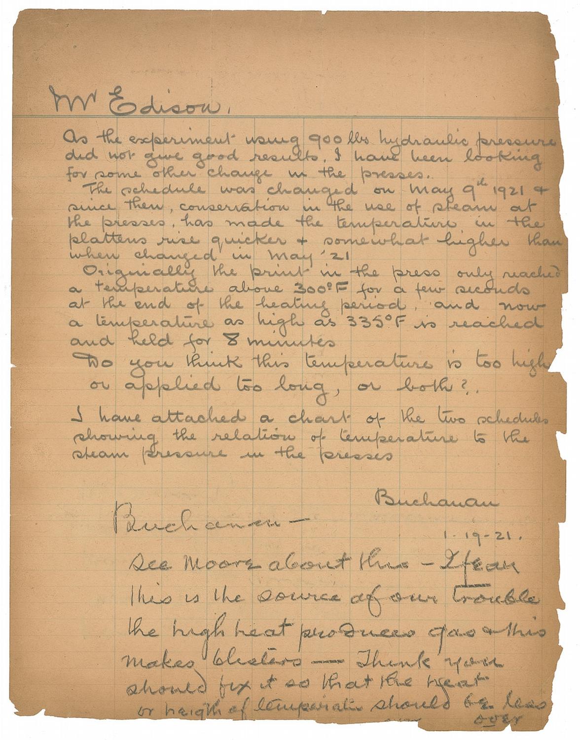 ALS, in pencil, signed “E,” one page both sides, 8.5 x 11, January 19, 1921. Edison writes to [Jaffrey P.] Buchanan, manager of Edison’s Record Disc Division, at the bottom of a letter inquiring about temperature variations. Buchanan wrote, in part: “As the experiment using 900 lbs hydraulic pressure did not give good results I have been looking for some other change in the presses. The schedule was changed on May 9th, 1921 & since then, conservation in the use of steam at the presses has made the temperature...rise quicker & somewhat higher than when changed in May ‘21...Do you think this temperature is too high or applied too long, or both?” Edison’s response reads, in full: “See Moore about this—I fear this is the source of our trouble. The high heat produces gas & this makes blisters—think you should fix it…You can probably reduce the steam pressure down & my experiment making a wear list on each lot printed—all this & use of temp was unknown to me & is probably the cause of all our trouble.” In very good condition, with intersecting folds, moderate toning (heavier along the edges) and edge chipping.