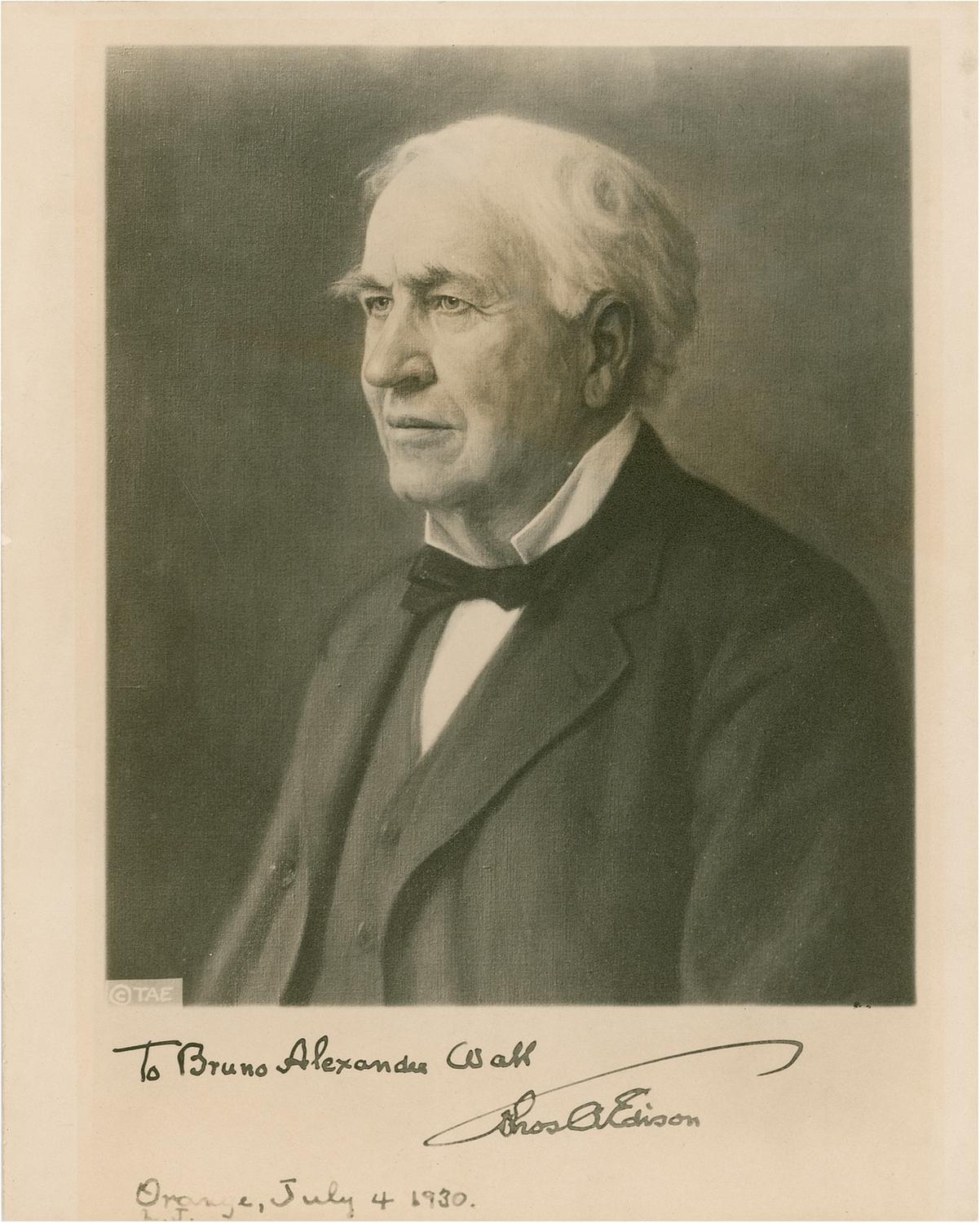Very nice vintage matte-finish 8 x 10 photo of a painting of Edison, boldly signed and inscribed in fountain pen in the blank lower border, “To Bruno Alexander Wall, Thos. A. Edison” and dated in another hand, “Orange, N.J., July 4, 1930.” In fine condition, with some scattered mild edge rippling. A sharp signature on a distinguished image portraying Edison’s determined gaze.
