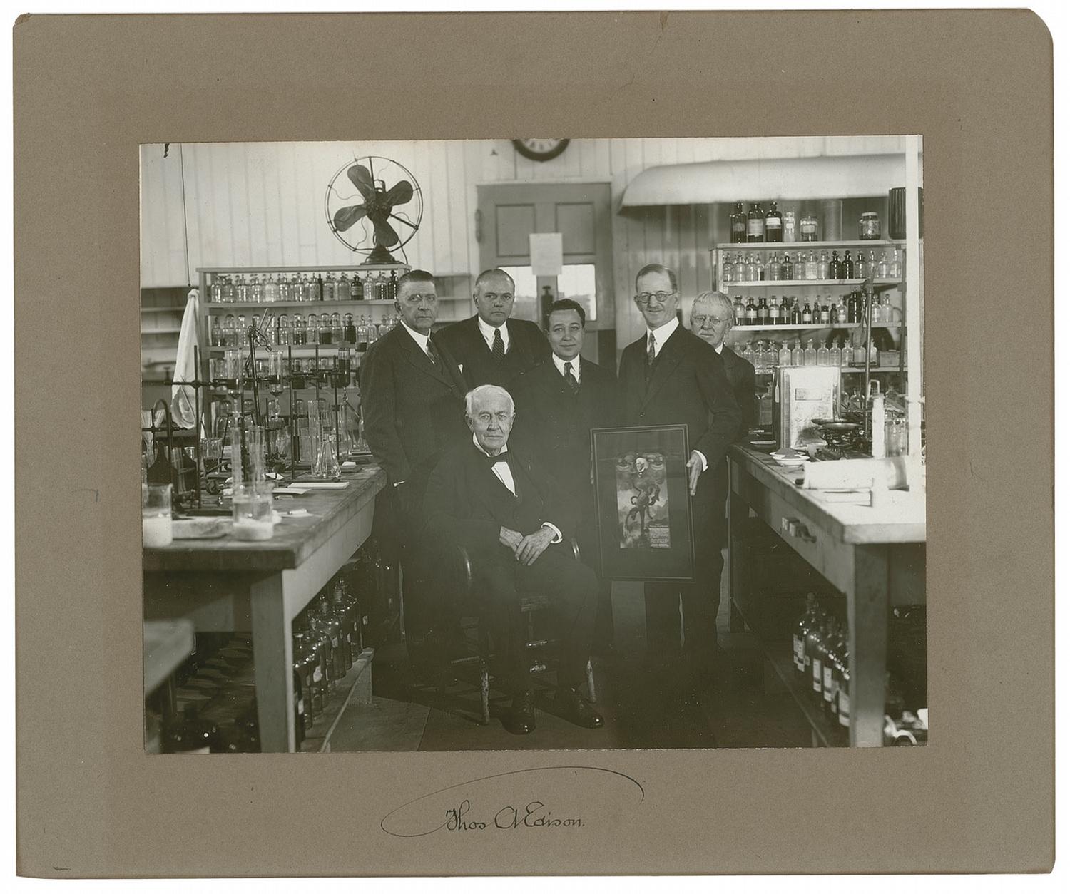 Vintage glossy 9 x 7 photo of Edison seated in the chemistry lab of his West Orange Laboratory, with his secretary William Meadowcroft and four other gentleman standing behind Edison, with one man holding a framed display of what appears to be a small tribute to Edison, and affixed to a 12 x 10 mount, signed on the mount in black ink, with his instantly-recognizable ‘umbrella’ signature, “Thos. A. Edison.” Lightly trimmed edges to photo, some scattered light silvering, a small tear to top of mount, and mild toning to mount from previous framing, otherwise fine condition. An excellent example of Edison in his element.