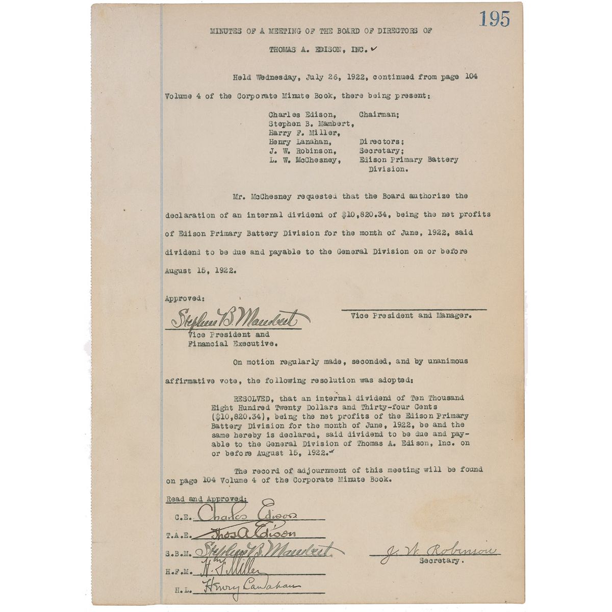 DS concerning A Meeting of the Board of Directors of Thomas A. Edison, Inc., one page, 8 x 11, July 26, 1922. Those members present are Chairmen Charles Edison, Stephen B. Mambert, and Harry F. Miller; Director Henry Lanahan; Secretary J. W. Robinson; and L. W. McChesney of the Edison Primary Battery Division. The minutes describe a meeting called regarding McChesney’s request “that the Board authorize the declaration of an internal dividend of $10,820.34, being the net profits of Edison Primary Battery Division for the month of June, 1922, said dividend to be due and payable to the General Division on or before August 15, 1922,” a motion that is approved and signed off by Vice President and Financial Executive, “Stephen M. Mambert,” the Board members, “Charles Edison,” “H . F. Miller,” “Henry Lanahan,” “J. W. Robinson,” Mambert again, and boldly, “Thos. A. Edison.” Uniform toning with some heavier areas along the edges, a few trivial spots of soiling, and light adhesive remnants along the left border, otherwise fine condition.