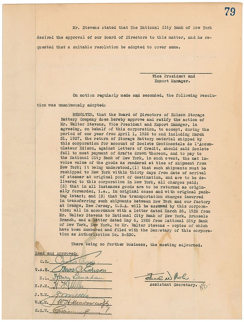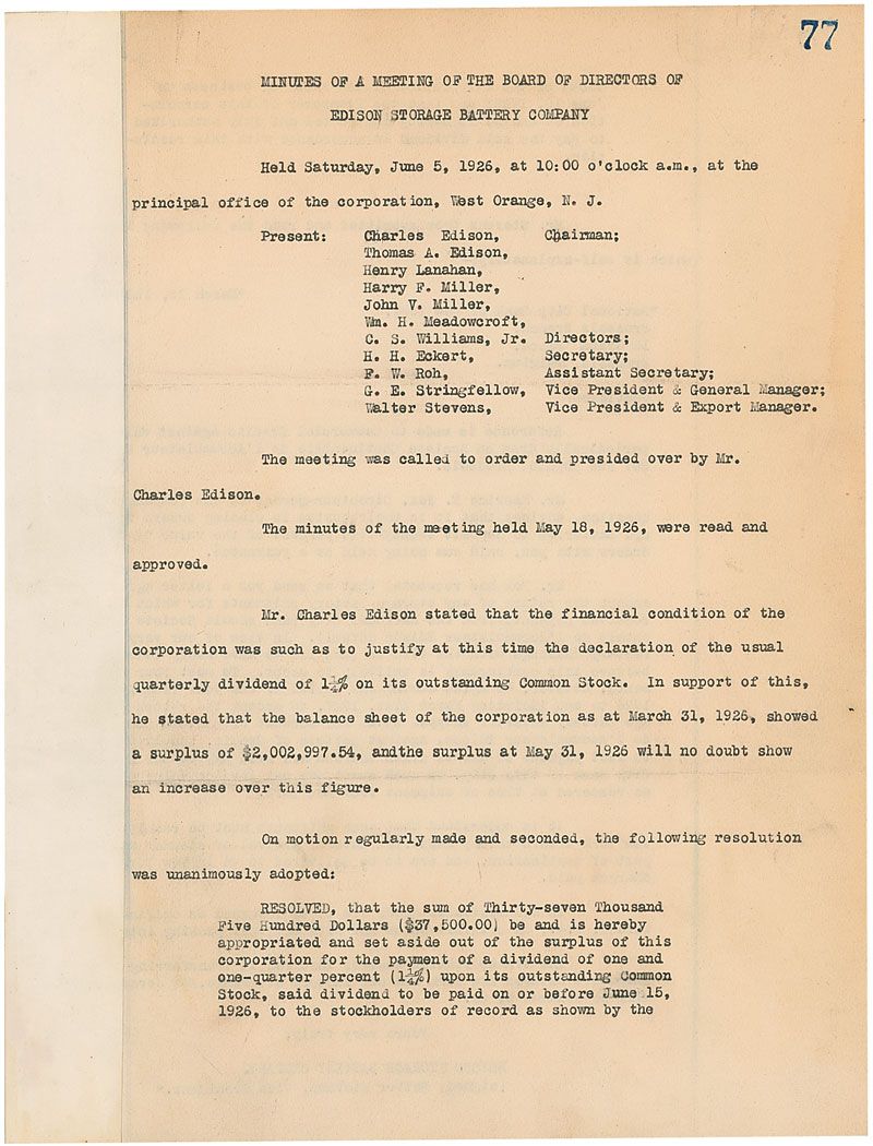 DS, signed “Thos A. Edison,” three pages on two sheets, 8.5 x 11, June 5, 1926. Minutes of a Meeting of the Board of Directors of the Edison Storage Battery Co. Charles Edison reports “the financial condition of the corporation was such as to justify at the time the declaration of the usual quarterly dividend of 1 1/4% on its outstanding Common Stock. In support of this, he stated that the balance sheet of the corporation as of March 31, 1926, showed a surplus of $2,002,997.54, and the surplus at May 31, 1926 will no doubt show an increase over this figure.” The board then resolves to pay the dividend. Signed at the conclusion by Edison, his son Charles, and five other board members including Stephen B. Mambert. In very good condition, with horizontal folds to both pages, uniform toning, some light dampstaining, one affecting middle initial of signature, and binding reinforcement to left edges.