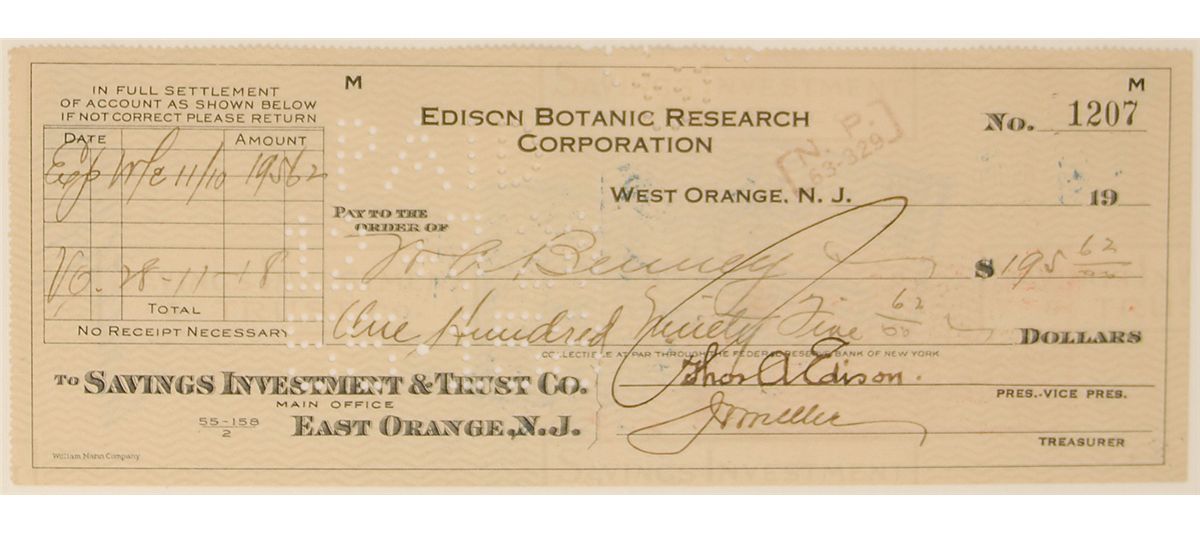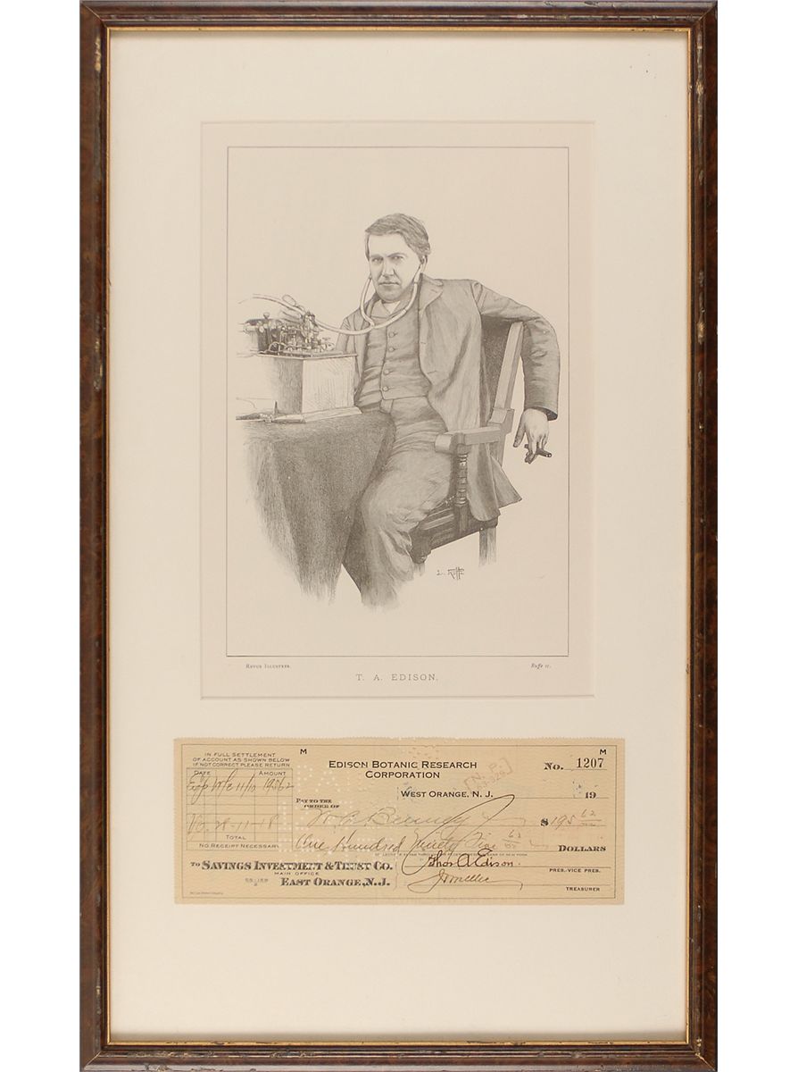 Edison Botanic Research Corporation business check, 8.25 x 3, filled out in another hand and signed by Edison, “Thos. A. Edison,” payable to W. A. Benney for $195.62. Check appears to be mounted and framed with an engraved portrait of Edison, to an overall size of 11.75 x 20. A central vertical fold, expected cancellation holes and stamps, light show-through from stamps on reverse, and Edison’s ‘umbrella’ extending into payline, otherwise fine condition.