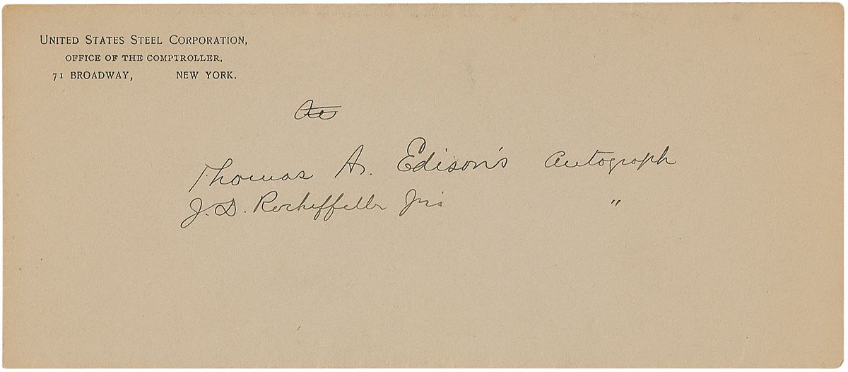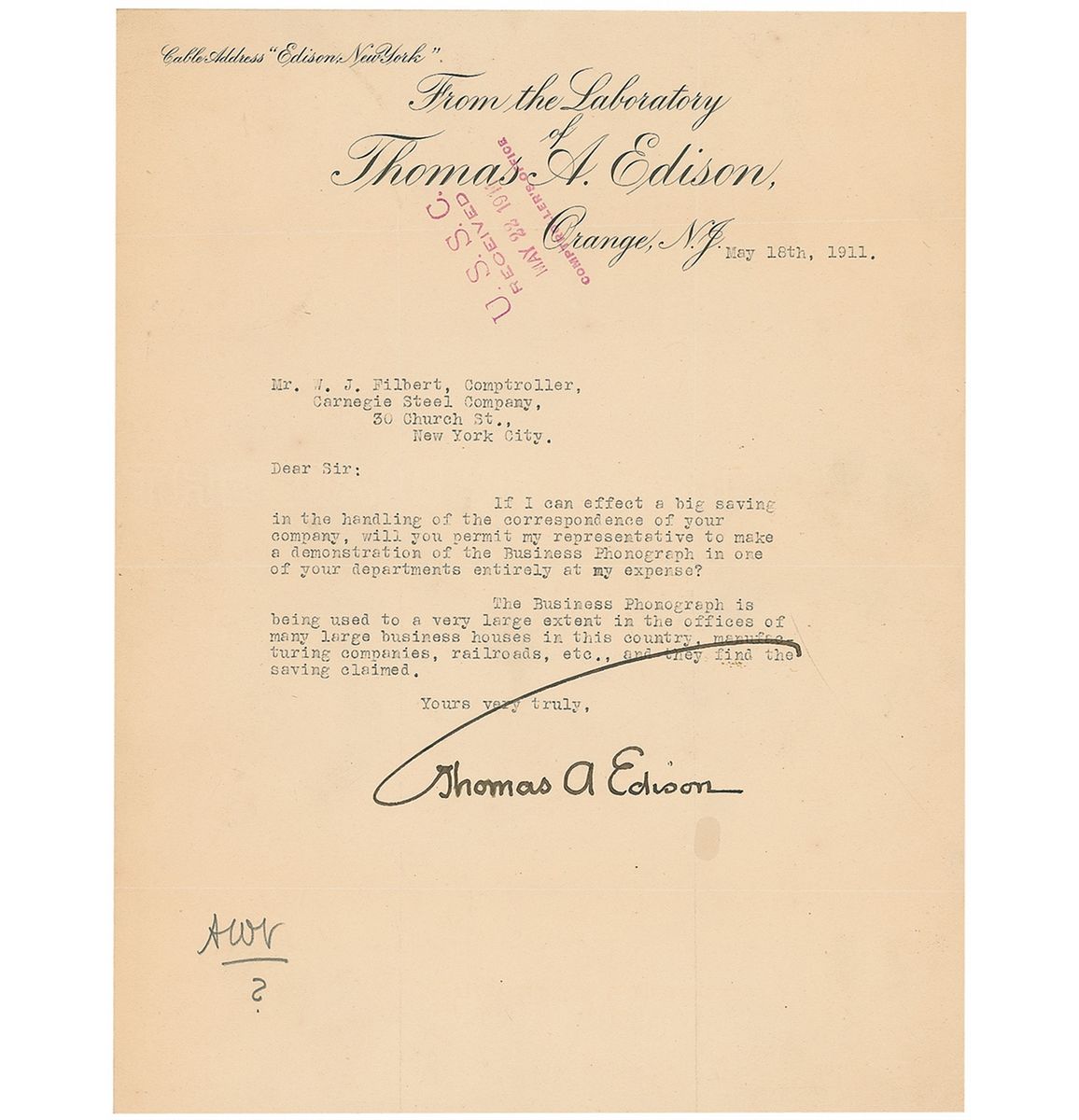 TLS signed with his impressive ‘umbrella’ signature, “Thomas A. Edison,” one page, 8.25 x 11, From the Laboratory of Thomas A. Edison letterhead, May 18, 1911. Letter to W. J. Filbert, Comptroller of Carnegie Steel. In full: “If I can effect a big saving in the handling of the correspondence of your company, will you permit my representative to make a demonstration of the Business Phonograph in one of your departments entirely at my expense? The Business Phonograph is being used to a very large extent in the offices of many large business houses in this country, manufacturing companies, railroads, etc., and they find the saving claimed.” Intersecting folds, with two vertical folds passing through beginning and end of signature, an office stamp to top, small pencil notation to lower left, and a mild shade of toning, otherwise fine condition.