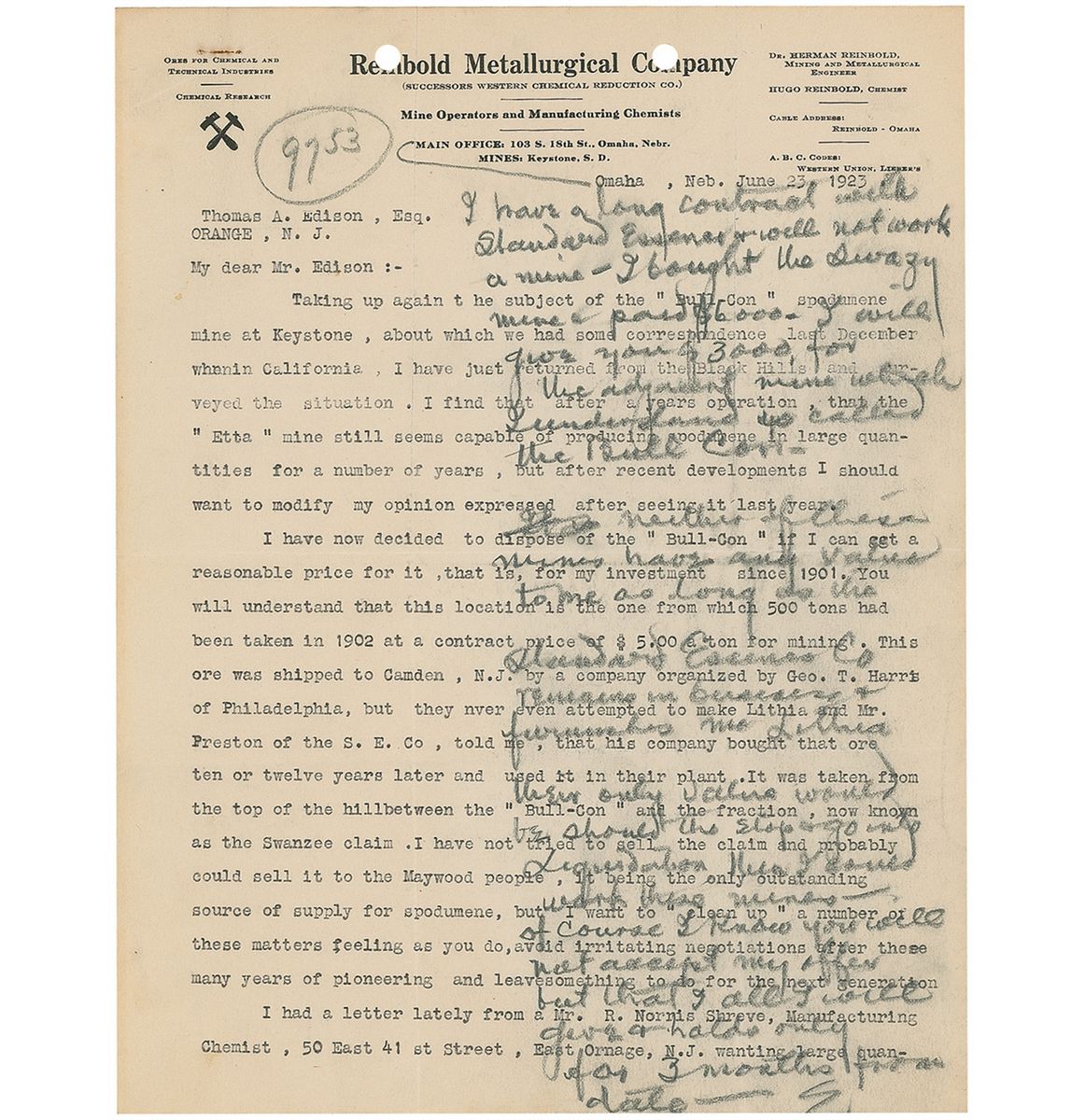 ALS signed “E,” one page, 8.5 x 11, no date. Letter written by Edison on the first page of a two-page TLS to Edison, dated June 23, 1923, from Herman Reinbold regarding the sale of a spodumene mine called “Bull–Con.” Reinbold concludes his letter with, “If you are still interested in the ‘Bull–Con’ Claim, please let me know—I have no doubt, that whatever you invest will yield an independent supply of ore, whenever it should be need by your company.” Edison’s response reads, in full: “I have received your letter of June 23rd, in regard to the ‘Bull-Con’ spodumene mine at Keystone. I have a long contract with the Standard Essence Co. and will not work a mine. I bought the Swanzy mine and paid $6000 for it. I will give you $3000 for the adjacent mine, which I understand is called ‘Bull-Con.’ Neither of these mines has any value to me as long as the Standard Essence Co. remains in business and furnishes me with lithia. The only value these mines would have would be in case the Standard Essence Co. would stop and go into liquidation. Then I could work these mines for myself. Of course, I know you will not accept my offer, but that is all I will give and this offer will hold good only for three months from this date.” In very good condition, with intersecting folds, some light contrast to Edison’s handwriting over typed text, expected light soiling from the pencil, punch and staple holes to top edge and a bit of light toning.