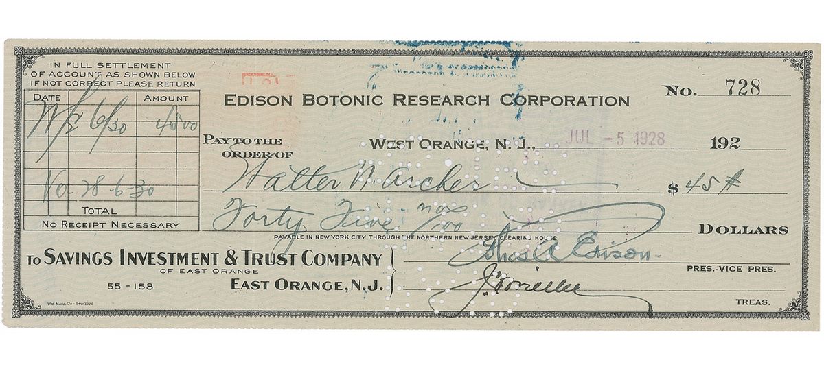 Edison Botanic Research Corporation business check, 8.5 x 3, filled out in another hand and signed by Edison, “Thos. A. Edison,” payable to Walter Archer for $45, stamp-dated July 5, 1928. A single vertical fold, expected cancellation stamps and holes, with some holes affecting the first half of the signature, and stray ink stamp to the top, otherwise fine condition.
