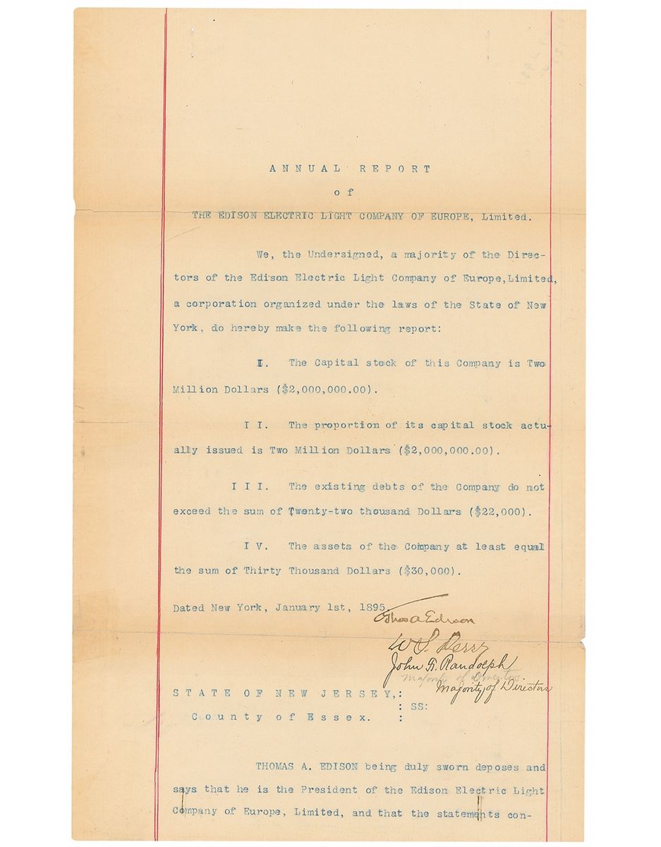 DS, signed “Thos. A. Edison,” one page, 8 x 12.75, January 1, 1895. An extract from the annual report of the Edison Electric Light Company of Europe, reporting the value of capital stock at two million dollars and outstanding debts totaling less than $22,000. Signed at the conclusion by Edison and three others. In very good condition, with mild toning and wrinkling, pinholes, and complete separations at folds (repaired from the reverse with archival tape; not affecting signature). Backed by financiers, including J.P. Morgan and the Vanderbilt family, Edison established the Edison Electric Light Company to own and license his patents in the electric light field. After more than a year of experiments, Edison finally developed a carbon filament that would burn in a vacuum in a glass bulb for forty hours. They demonstrated the light bulb to their backers, and by the end of the month were exhibiting the invention to the public. Any document signed by Edison relating to his electric light company are very sought after by collectors.