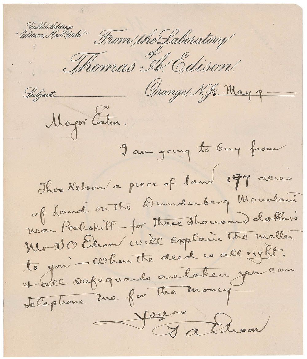 ALS signed “T. A. Edison,” one page, 5.5 x 6.5, From the Laboratory of Thomas A. Edison letterhead, May 9. Letter to Major Eaton. In full: “I am going to buy from Thos Nelson a piece of land 197 acres of Land on the Dunderberg Mountains near Peekskill—for three thousand dollar’s. Mr S O Edison will explain the matter to you—When the deed is all right & all safeguards are taken you can telephone me for the money.” Several dockets and notations in another hand are on the reverse. Intersecting folds, one in between initials, a diagonal crease to upper portion, staple holes to top left, and some scattered soiling, otherwise fine condition. In 1888, Edison had created a method for using electromagnets to separate and refine iron ore. Unfortunately, the iron ore produced was lower in quality than expected, the machinery broke down often, and the fine, crushed iron was difficult to work with.