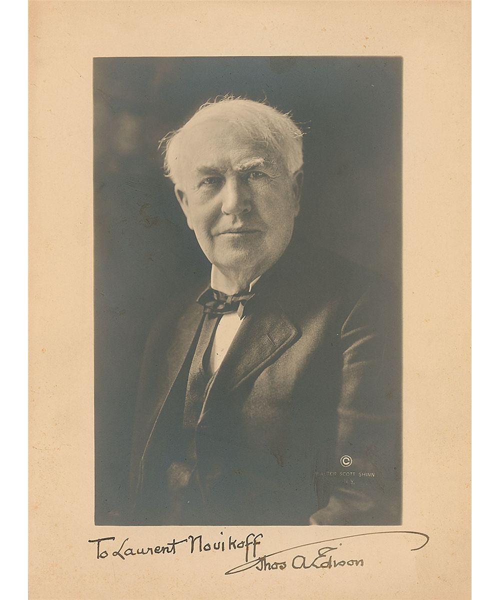 Distinguished vintage matte-finish 7.25 x 10 portrait by Walter Scott Shinn of New York, signed and inscribed in the lower border in fountain pen, “To Laurent Novikoff, Thos. A. Edison.” Silvering to dark areas of the image, some trivial foxing and toning to borders, and a lightly trimmed bottom edge, otherwise fine condition. Novikoff was a Russian ballet dancer who worked with Anna Pavlova before moving to the United States.