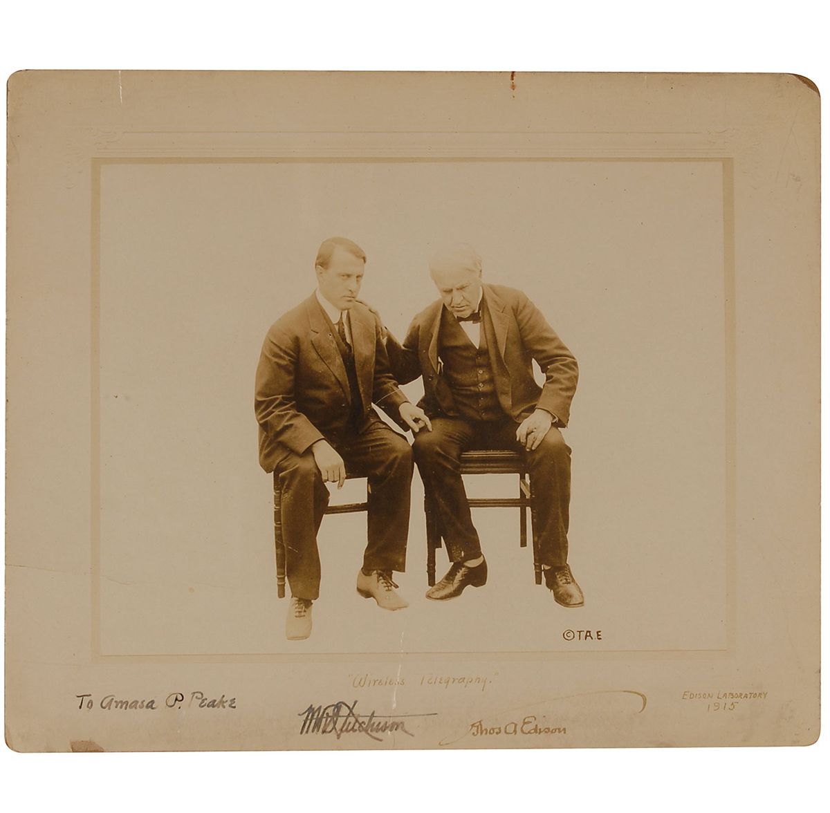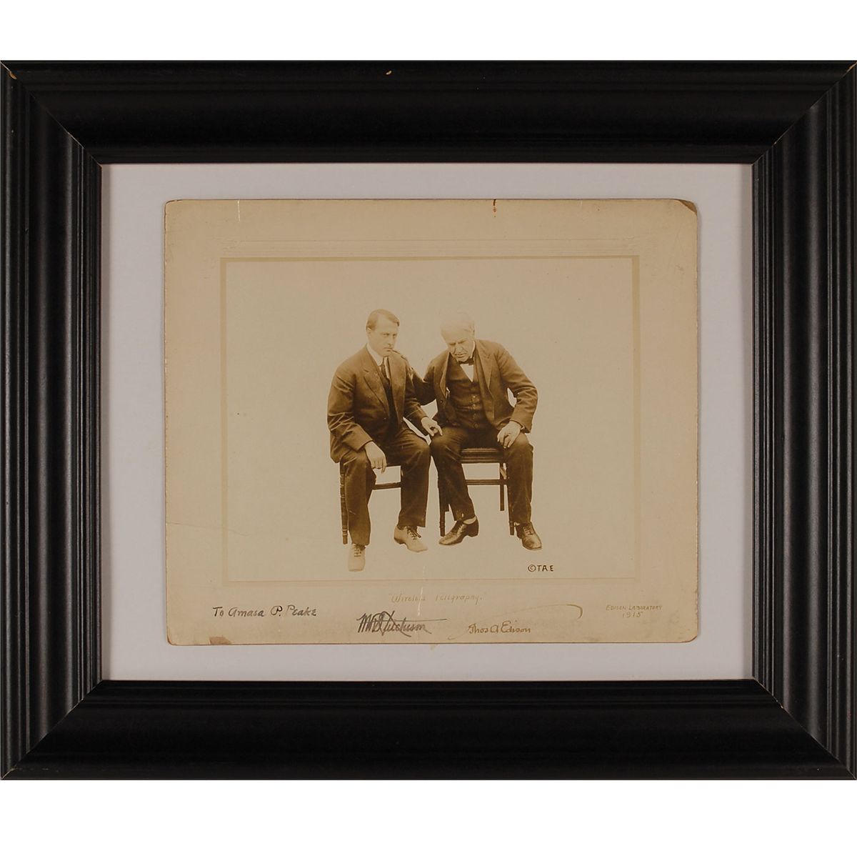 Vintage 10.75 x 9 photo of Edison and Miller Reese Hutchison discussing wireless telegraphy in 1915, signed in the lower border in fountain pen, “Thos A Edison,” and also signed and inscribed in black ink, “To Amasa P. Peake, M.R. Hutchison.” Framed to an overall size of 17.5 x 15. In very good condition, with several creases, a few small areas of surface loss to edges and corners, and inscription and Hutchison’s signatures traced over. Hutchison served as chief engineer of Edison's laboratory from August 1912 until July 1918. Photo originates from the great great granddaughter of Hutchison who stated that Edison presented the photo as thanks for his financial contributions to his experiments.