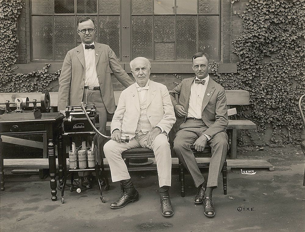 Original 9 x 7 glossy photo of Edison, clad in a bright white suit, one of his Dictaphone machines to his right, with the mouthpiece in his hand, posing with J. M. Dolley and O. K. Van Ausdall, bearing an Edison copyright in the photo, as well as a stamp on reverse. Reverse also has pencil notations of the negative number and states “Photo taken Aug 12, 1921, Pub. Aug 15, 1921.” In fine condition, with some scattered light surface marks. In 1914, Van Ausdall was chosen as a distributor for the Thomas Edison Company, and its wax cylinder dictating machine.