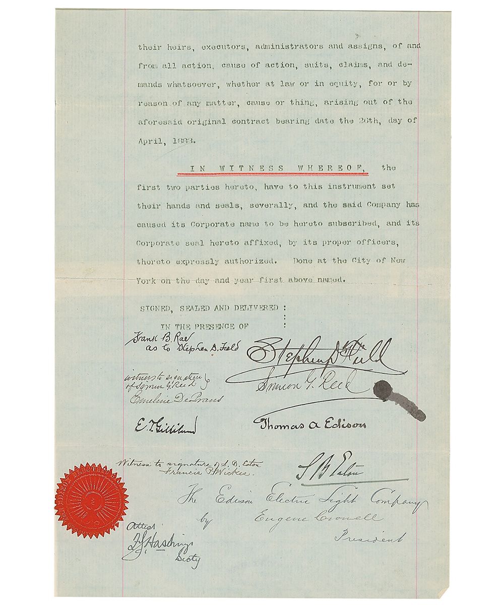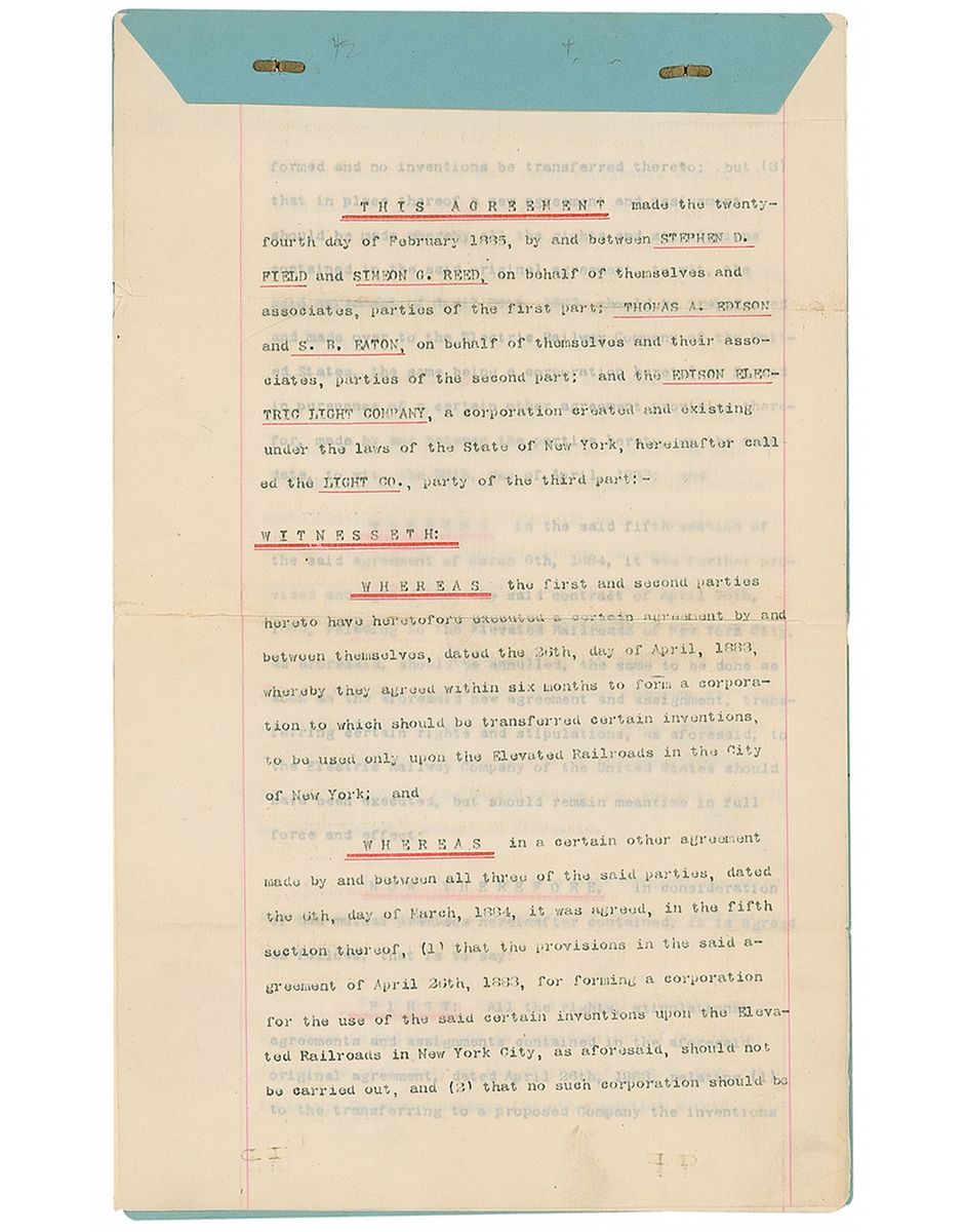 DS, signed “Thomas A. Edison,” four pages, 8 x 13, February 24, 1885. An agreement between Stephen D. Field and Simeon G. Reed (“parties of the first part”), Thomas A. Edison and S. B. Eaton (“parties of the second part”) and the Edison Electric Light Company (“party of the third part”), regarding the Electric Railway Company of the United States. Document concerns an agreement “to form a corporation to whom should be transferred certain inventions to be used only upon the Elevated Railroads in the City of New York.” Signed on the final page by Edison with his trademark ‘umbrella’ signature and also signed by Reed, Field, Eaton, and Eugene Crowell. Document is still stapled into its blue legal folder. In fine condition, with an ink spot above Edison’s paraph and some tape reinforcement to folds of folder. An embossed orange seal of the Edison Electric Light Company, depicting a radiant light bulb, has been affixed in the lower left of the signed page.