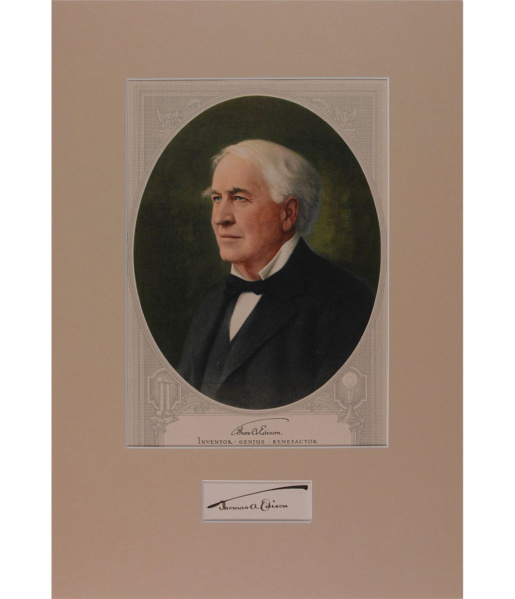 Superb ink ‘umbrella’ signature, “Thomas A. Edison,” on an off-white card. Matted with a color print of Edison to an overall size of 10.75 x 15.5. In very fine condition.