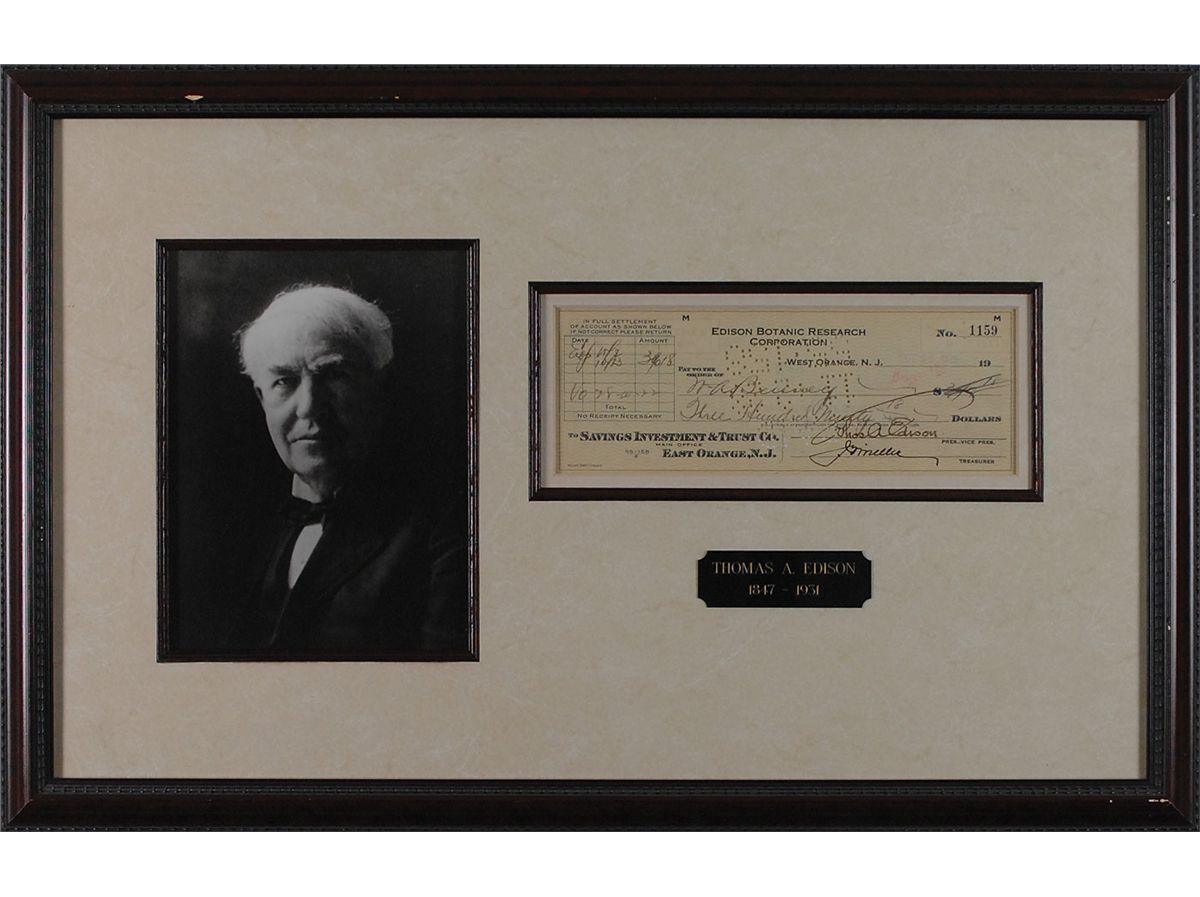 Edison Botanic Research Corporation business check, 8 x 3, filled out in another hand and signed by Edison with his bold ‘umbrella’ signature, “Thos A. Edison,” payable to W. A. Beucey for $390.18, stamp-dated October 22, 1928. Double-matted and framed with a portrait of Edison to an overall size of 21 x 13.5. A central vertical fold and cancellation holes to body, a few slightly affecting beginning of signature, otherwise fine condition.