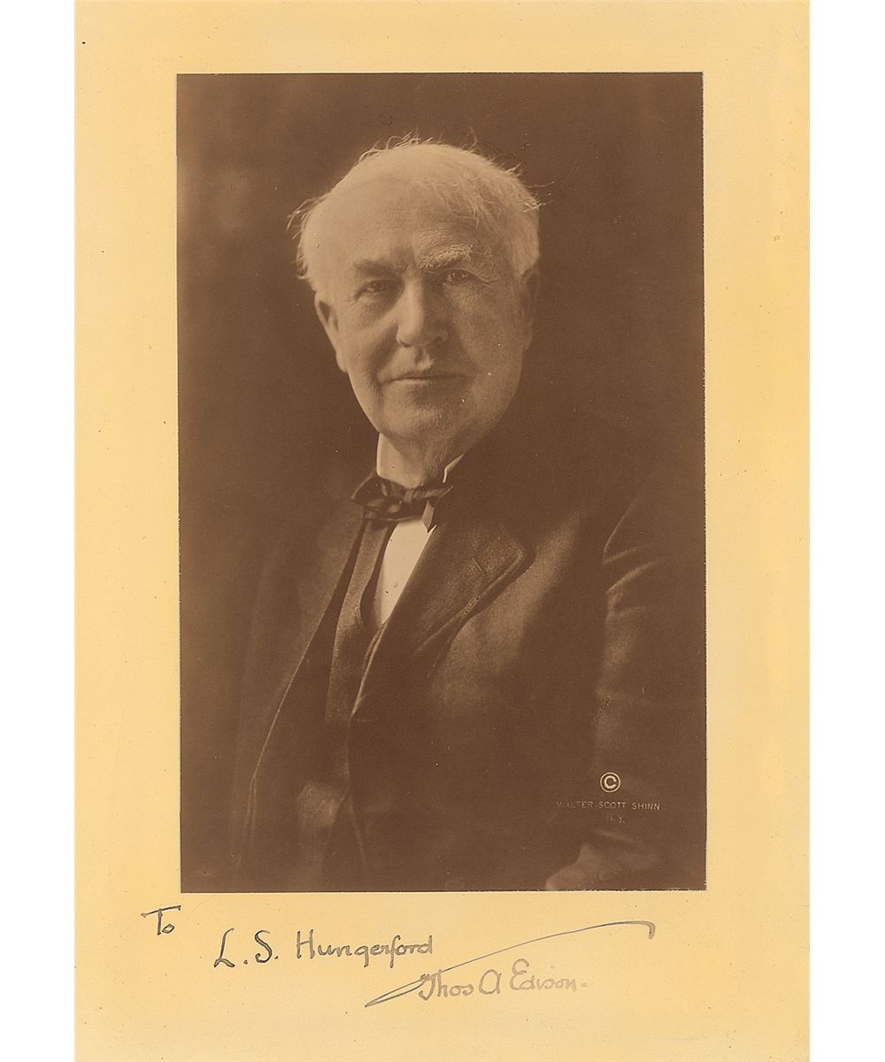 Outstanding vintage matte-finish 7 x 10 formal portrait of the inventor, signed and inscribed in the lower border in black ink with a fantastic ‘umbrella’ signature, “To L. S. Hungerford, Thos. A. Edison.” In fine condition.