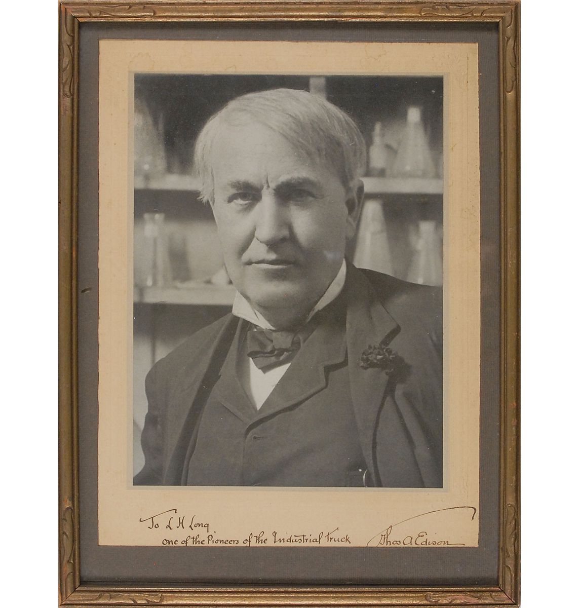 In 1921, the Automatic Transportation Company of Buffalo, NY, held an exhibit to show off the wide variety of industrial trucks in their factory, ranging from platform-lifting trucks to the superintendent's Shop Vehicle. The same year, under the leadership of second vice president L. H. Long, Automatic released their first electric vehicle. Having spent over a decade developing a long-lasting and easily rechargeable battery for the Ford Electric (released in 1914), Edison held great interest in the subject. This stunning photograph inscribed to a "Pioneer of the Industrial Truck," captures an important part of the inventor's career, and an industry that, owing much to Edison's work, continues to develop to this day.